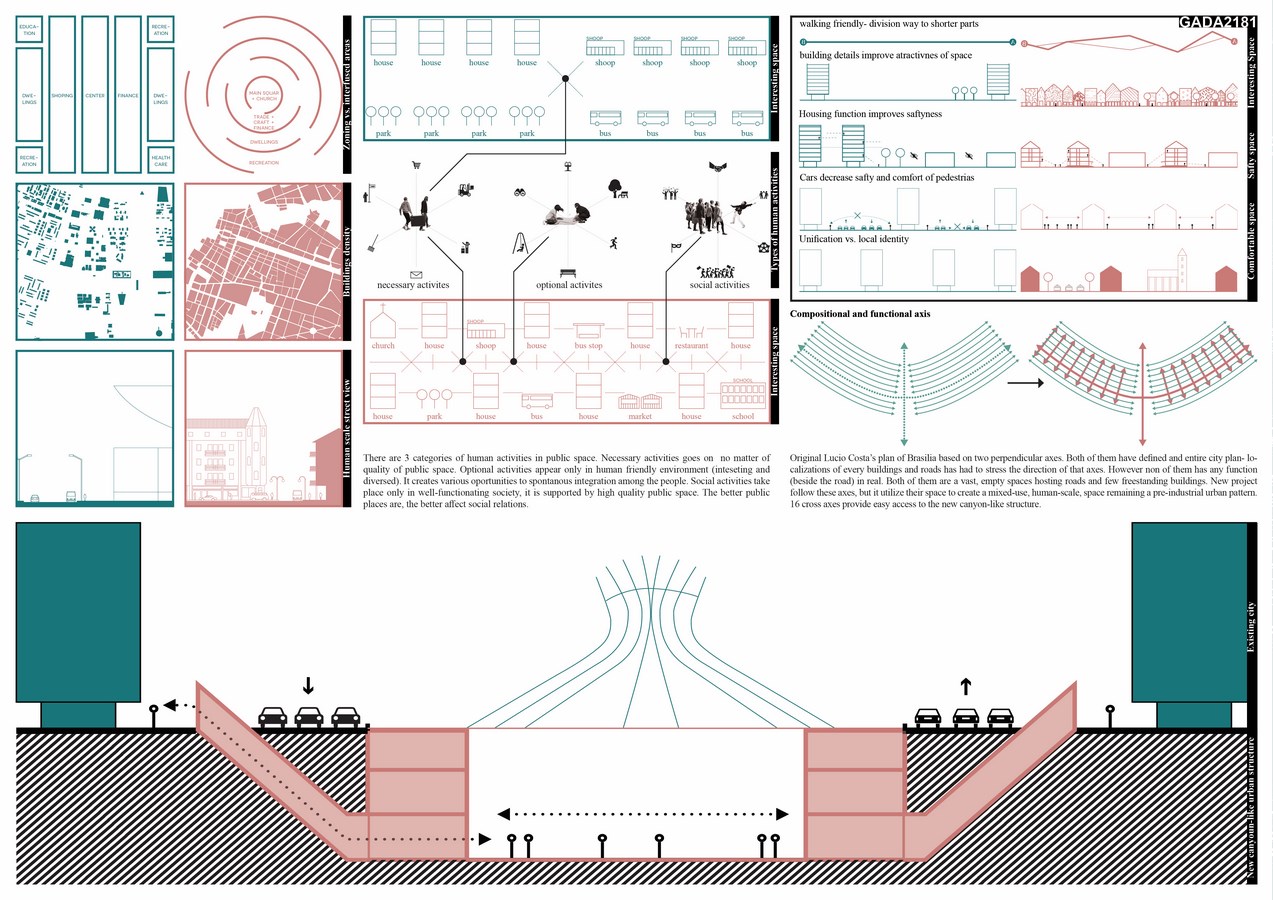 In response to modernist definition of Brasilia in ideological, urban and architectural terms, the idea of new structure is a kind of antithesis of the original plan. It concerns about density of population and buildings, zoning, pedestrians, typology of buildings, public spaces, greenery, local identity, human scale etc. The new project is implemented to spread out in the entire space of the original city, to improve the quality of life in each of its fragment, emphasizing the most important composite axes of the original assumption. However, it is not an attempt of discrediting modernist ideas that were largely right, but used in uncompromising and excessive way lead to many social dysfunctions. ‘Brasilia. Below the city’ only makes sense when it complements the deficiencies of the original city. These two urban systems within one space, do not compete with each other, but they complement each other, creating a one cohesive city.