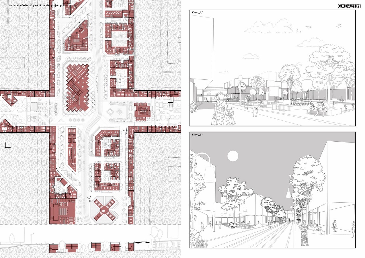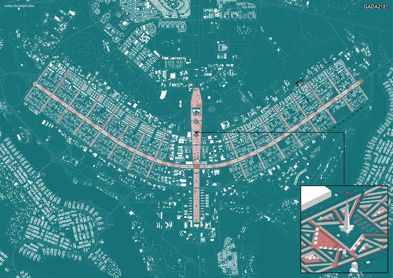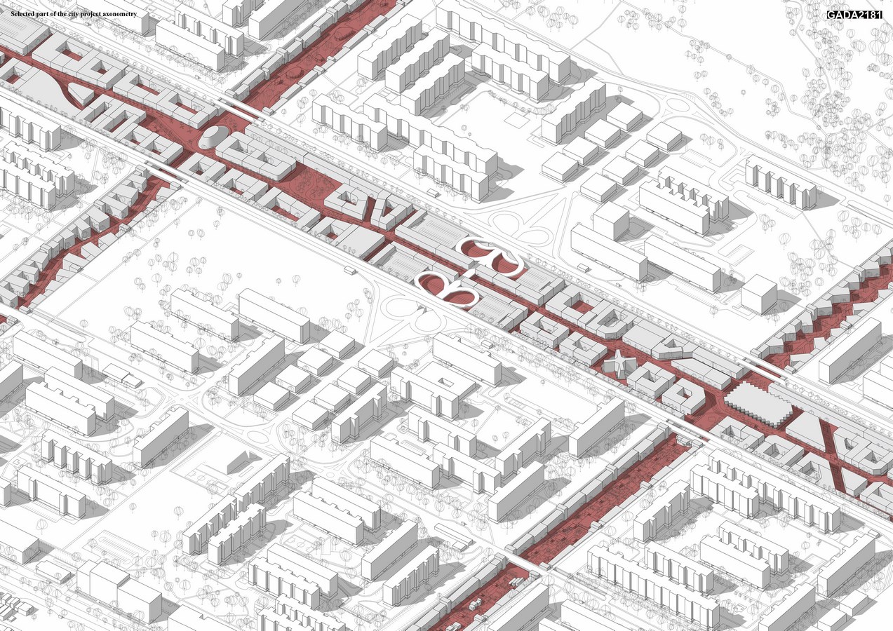 The project assumes the coexistence of two independent urban systems on one land. The First assumption is the original structure, preserving all its advantages and disadvantages. The second one is a newly designed urban structure that utilize undeveloped space (composite axes) in the original design, based on well-functioning, pre-industrial city-patterns, that were the results of empirical experiences, needs and activities, being a place of rich social life. The boundary between these two structures is strict and clear, based on a vertical division. Existing urban fabric rises from 0.00 meters upwards, while the newly designed structure, goes down from 0.00 to -12 meters. New project is entirely set inside the huge, canyon-like structure, where none of the buildings exceeds the level of adjacent terrain. Thanks to that, spatial form of this modernist city is not changed at all.