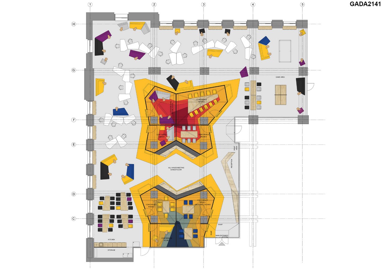 The functional requirement for flexibility and adaptability to the company growth is designed within many custom elements. The unique 5-sided worktop of the desks allows for multiple reconfigurations and regrouping of the desks into small or large organic clusters. The colourful custom soft seating modules can be mixed and matched into unique lounge sets. The custom light fixture modules are again organized into clusters, adapted to the site to illuminate key zones.