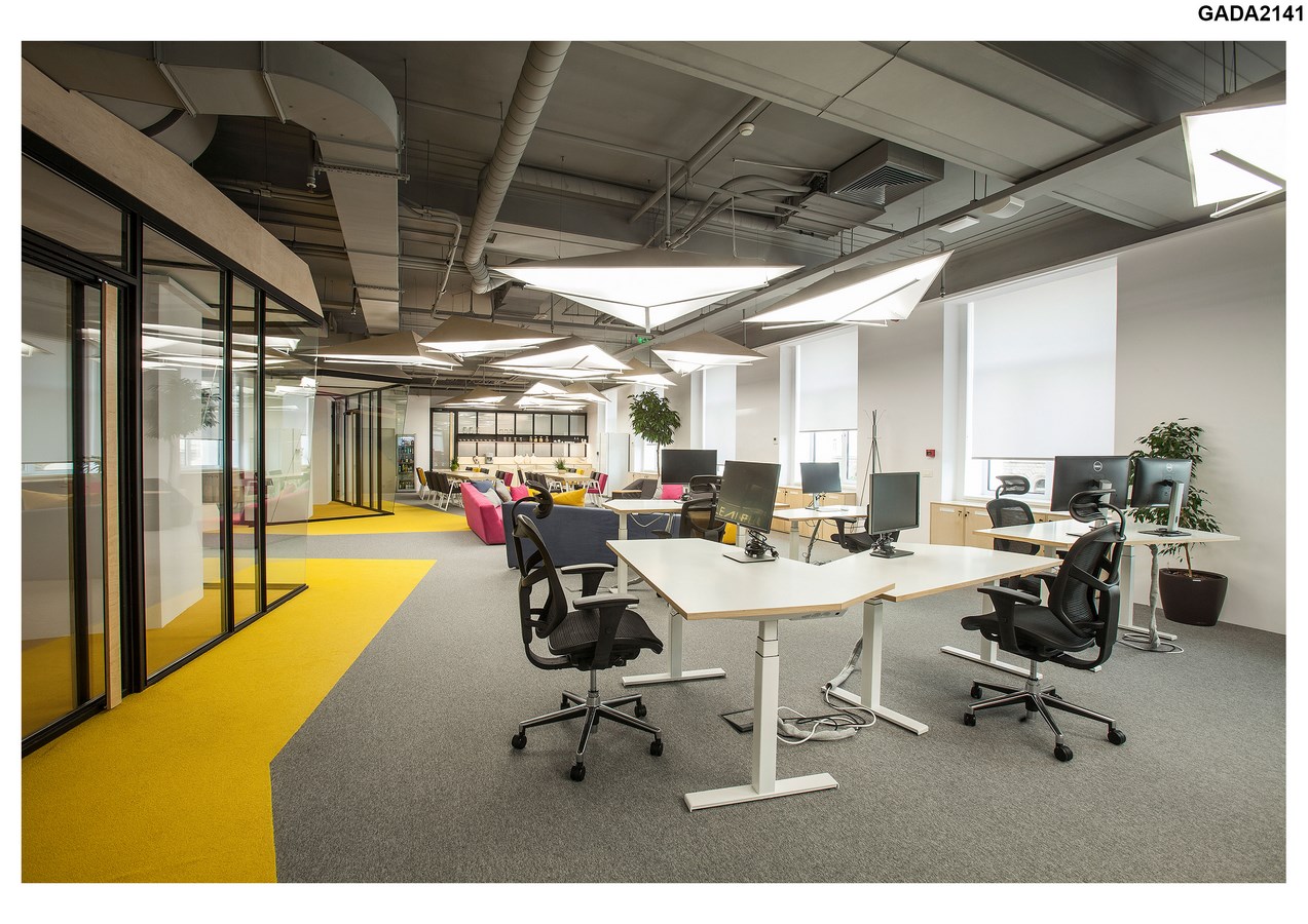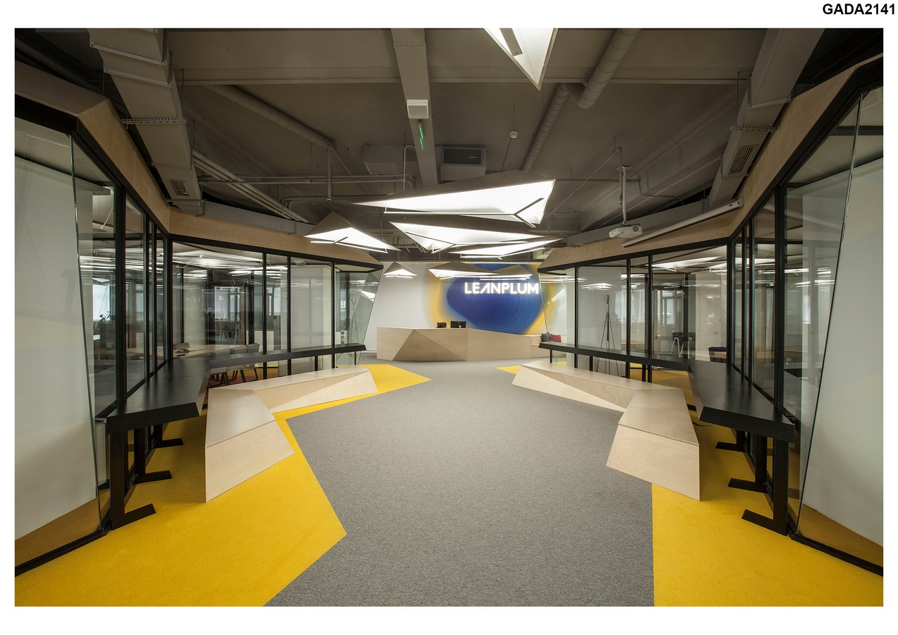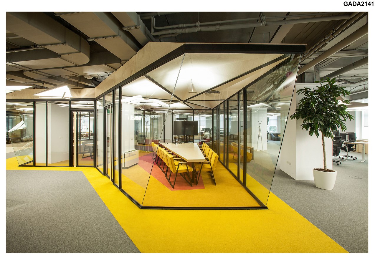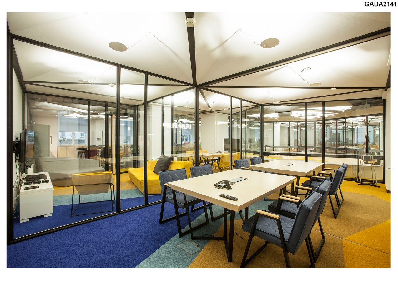The artistic goal for the design of the space was to imagine an office interior as a “city”, which facilitates a variety of activities throughout an intense workday in a closed environment. The traditional workplace is reinvented with the introduction of new spatial elements, such as a conference room as a “house” and an open meeting area as a “square”. The repetition of these elements and colour coded carpet pattern define “city zones”, that promote informal teamwork, meaningful connection, innovation and doer mentality.