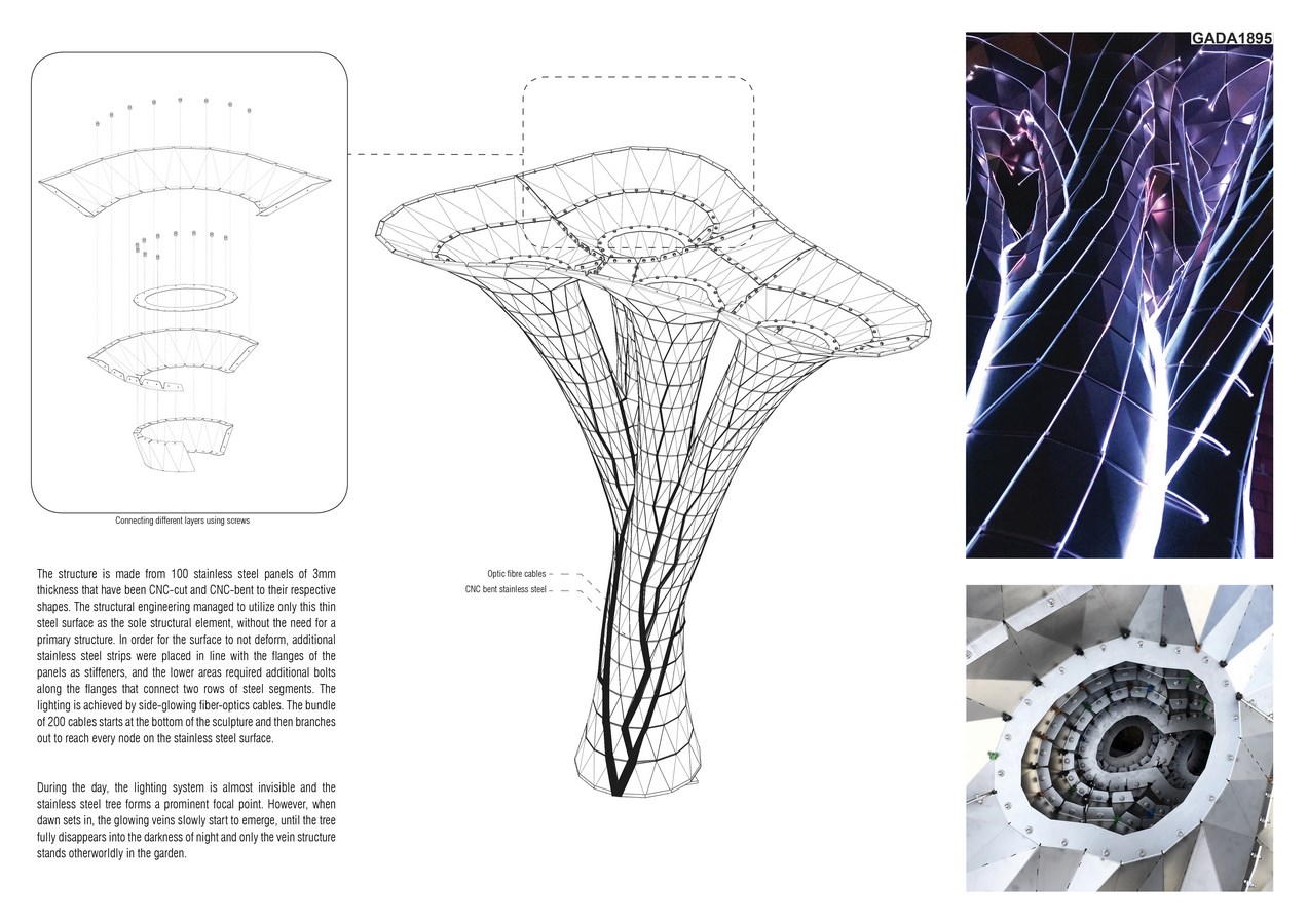 The concept was materialized in form of a stainless steel sculpture, with a branching optic fiber veins growing on top of it. The form for both the tree and the branching veins was derived using computational growth algorithms which simulate the need of plants to reach the sun light or of veins in leaves to supply every cell with nutrients. It was applied specifically in a warped space to have the branching appear mostly on the front side of the sculpture. The stainless steel was CNC cut and CNC bent to precise angles into their respective pieces which were assembled together using nuts and bolts. The tree-form was assembled layer by layer; with extra stainless steel plates added every few layers to reinforce the structure. Onto the skin, over 200 side-glowing optic fiber cables were attached to light up the sculpture during the night.