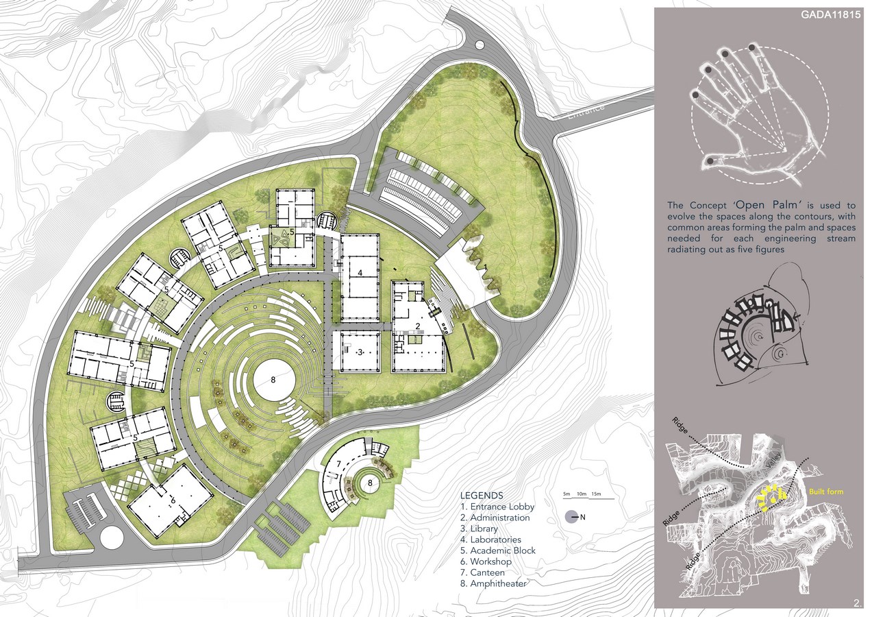 Located on a twenty-six acre parcel of hilly land on the way to Trimbakeshwar, the Sandip Foundation, College of Engineering campus serves as a microcosm for budding engineers to learn, interact and build memories. Spaces for learning, interaction and recreation flow in and out of the built form in a rhythmic pattern, creating paths and goals in an alternating repetition. The concept of an open palm is used to evolve the spaces along the contours, with common areas forming the palm and spaces needed for each engineering stream radiating out as five fingers.