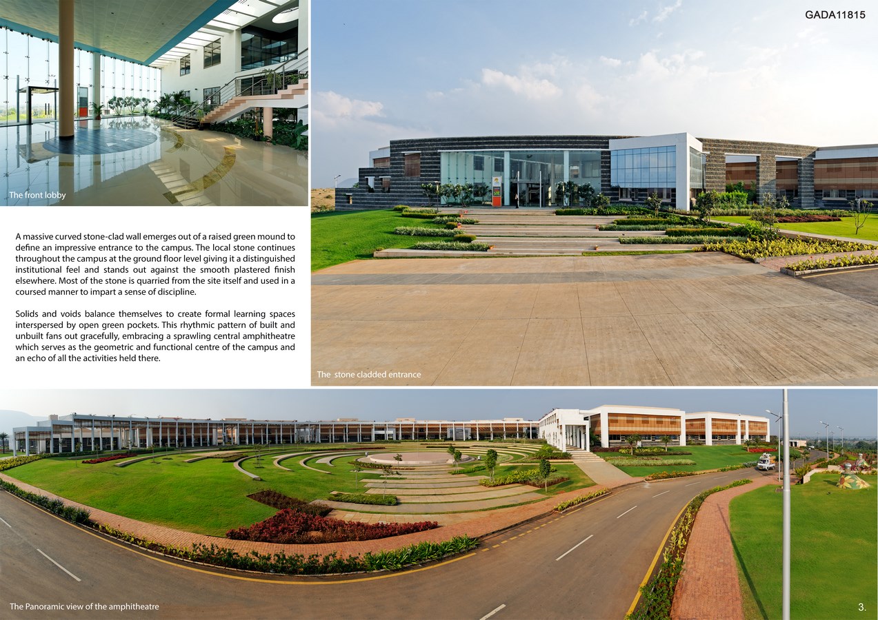 A massive curved stone-clad wall emerges out of a raised green mound to define an impressive entrance to the campus. The local stone continues throughout the campus at the ground floor level giving it a distinguished institutional feel and stands out against the smooth plastered finish elsewhere. Most of the stone is quarried from the site itself and used in a coursed manner to impart a sense of discipline.