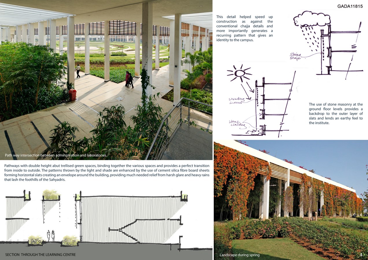 Pathways with double height abut trellised green spaces, binding together the various spaces and providing a perfect transition from inside to outside. The patterns thrown by the light and shade is enhanced by use of cement silica fibre board sheets forming horizontal slats creating an envelope around the buildings, providing much needed relief from harsh glare and heavy rains that lash the foothills of the Sahyadris. This detail was also used to speed up construction as against conventional chajja details. More importantly it separates the structure from the skin, generating a recurring pattern that gives an identity to the campus.