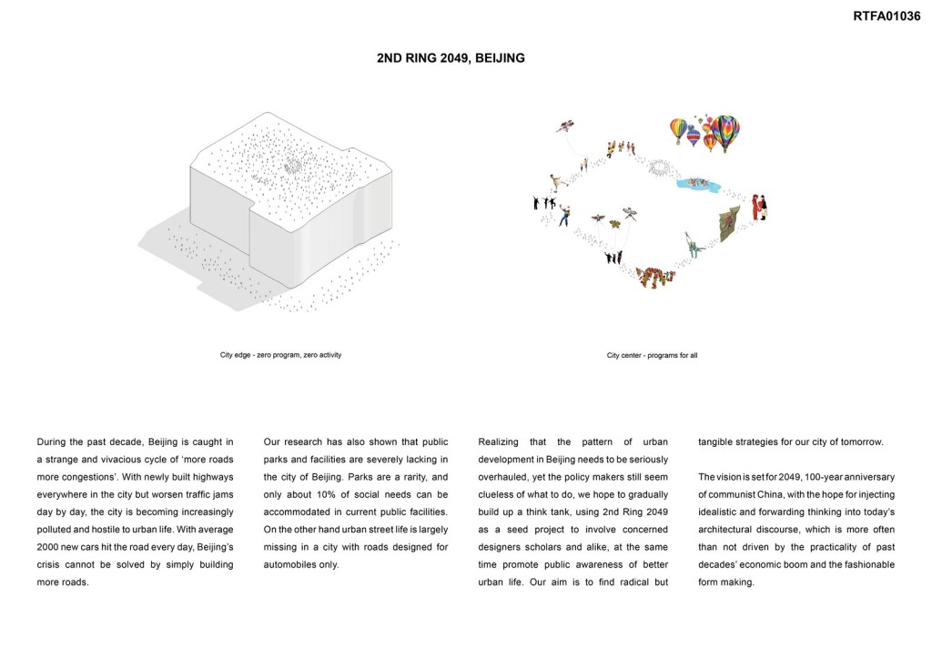 Realizing that the pattern of urban development in Beijing needs to be seriously overhauled, yet the policy makers still seem clueless of what to do, we hope to gradually build up a think tank, using 2nd Ring 2049 as a seed project to involve concerned designers scholars and alike, at the same time promote public awareness of better urban life. Our aim is to find radical but tangible strategies for our city of tomorrow.