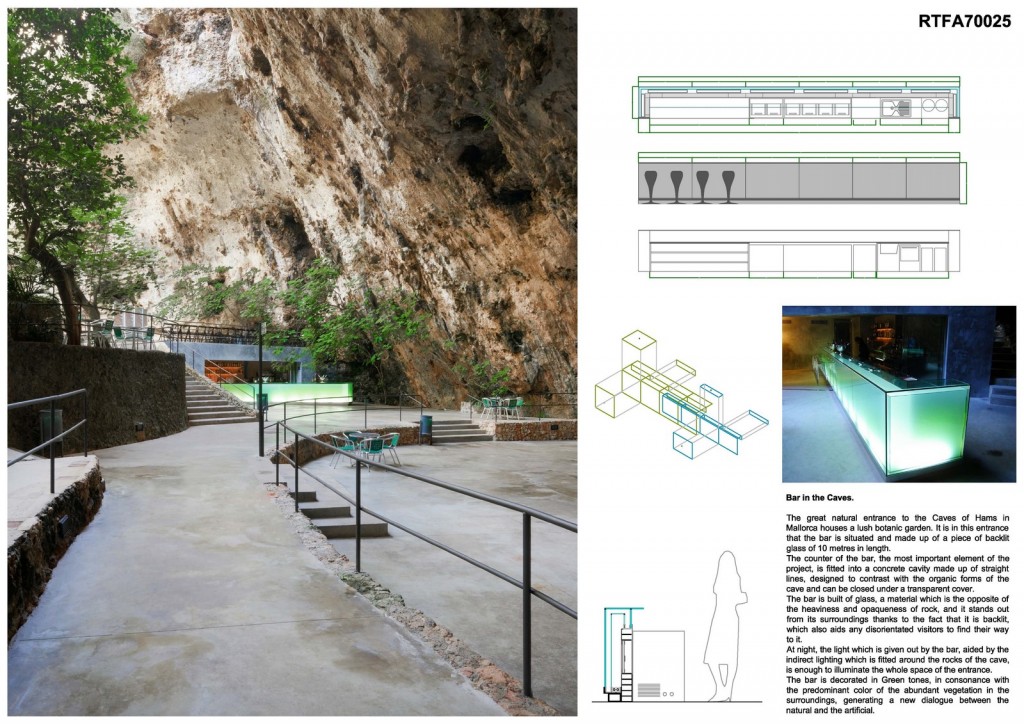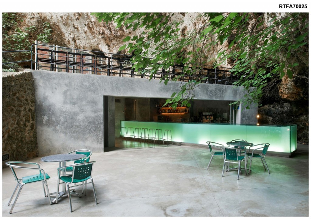 The great natural entrance to the Caves of Hams in Mallorca houses a lush botanic garden. It is in this entrance that the bar is situated and made up of a piece of backlit glass of 10 metres in length.