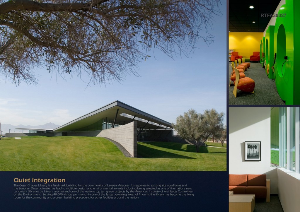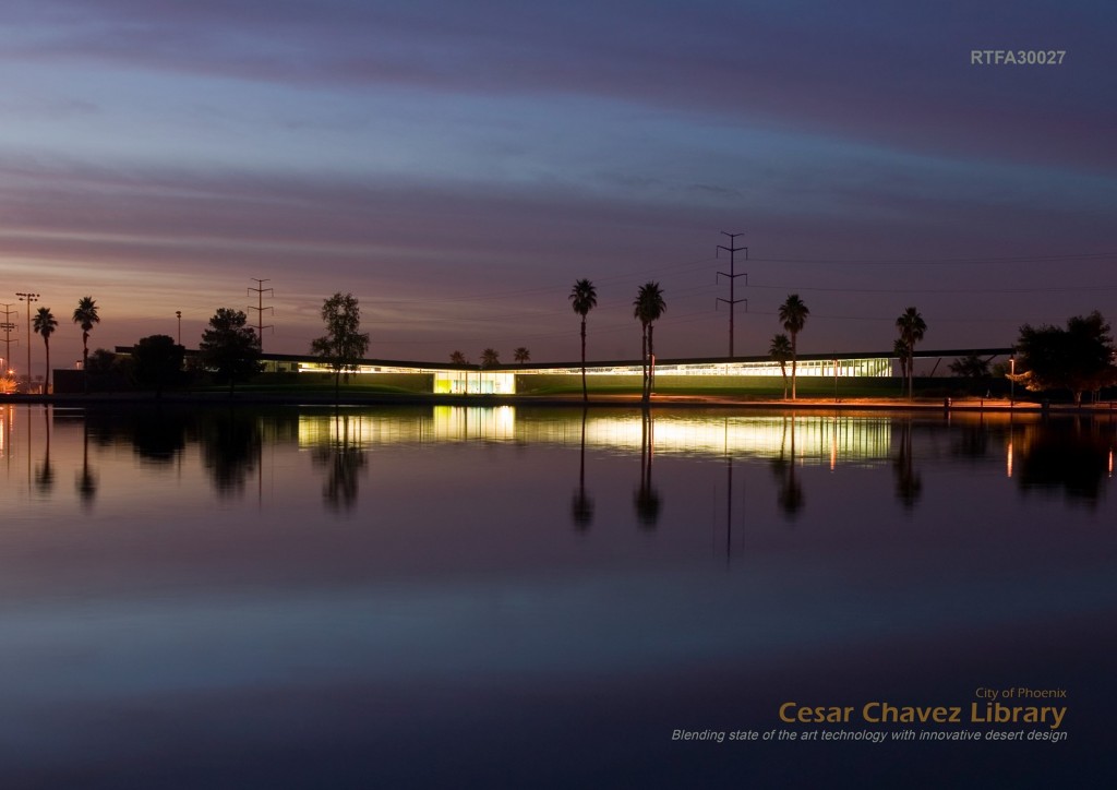 Completed in January 2007, the Cesar Chavez Library is a landmark building for the community of Laveen, Arizona. Its response to existing site conditions and desert climate has led to its receipt of multiple design awards and ardent community support. Resource conserving ideas such as proper solar orientation, the use of tempered microclimates, water harvesting and conservation, natural daylighting and use of appropriate materials are integral to the design of the Library. The architectural expression of these design features help the building itself become an educational tool, teaching its users the value of appropriate design for the Sonoran Desert.