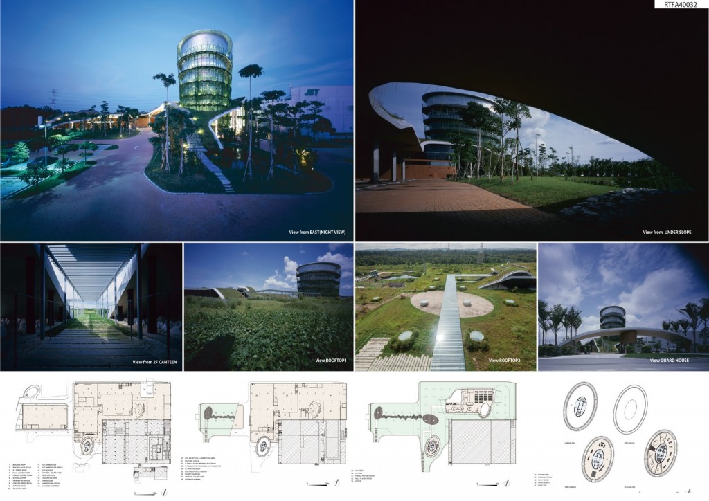 The below factory space is structurally arranged by hexagonal shaped pillars with a star shaped top derived from the arabesque patterns from Islamic culture, making this forest of pillars transform the space, a reference to the surrounding jungle. The rain water that pours down the rooftop is pooled into and underground water storage tank through the pipes embedded in the pillars and is used cyclically to watering the plants. Also when flowing into the pond and the wind blows, the rain water that pours down over the rooftop slope, brings a cold breeze to the space that makes the transition between exterior and interior under the roof.