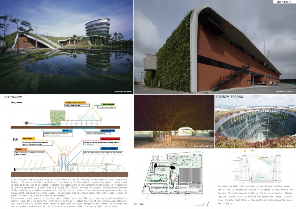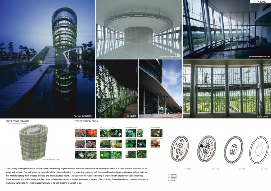 The façade of the high rise building is provided with a system of wired with vines, these vines not only shield the façade from solar radiation but creates a vertical green wall, a symbol of this building. Natural ventilation is carried through the multistory building to the lower spaces thankfully to its high creating a current of air. A building that combines nature into itself and blends with its surroundings it’s the type of factory that can make use of a rich environment and makes a connection with its region.