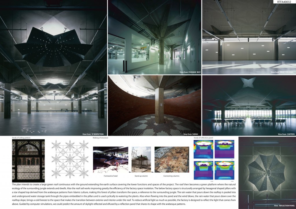 To reduce artificial light as much as possible, the factory is designed to reflect the light that comes from above. Guided by computer simulations, we could predict the amount of skylight reflected and difused by a reflection panel that shares its shape with the arabesque patterns. A multistory building houses the office function, this building aligned with the east-west axis allows for a minimized effect of a solar radiation projected on its outer wall surface. The slab along the perimeter of the high-rise building is a slope that connects with the ground level making a continuous walking path for the workers making them practice exercise and improving their health.