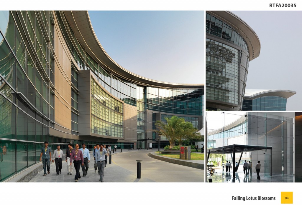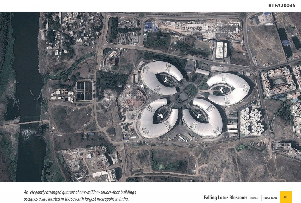 Located in the seventh largest metropolis in India, Falling Lotus Blossoms: EON IT Park is an elegantly arranged quartet of one-million-square-foot buildings that occupy a site located in the EON Free Zone, a Special Economic Zone (SEZ) established by the government to encourage development. This 21st-century workplace, which sets a grand scale in counterpoint to the rugged Indian countryside, overlooks a river and the fields beyond on a flat site that was previously almost entirely untouched. Inspired by nature—India’s national flower, the white lotus—the design began as different iterations of the shape of the lotus flower petal.