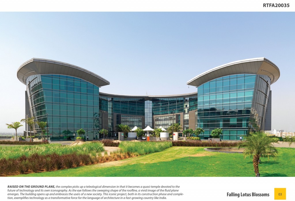 Raised on the ground plane, the complex picks up a teleological dimension in that it becomes a quasi-temple devoted to the future of technology and its own iconography. As the eye follows the sweeping shape of the roofline, a vivid image of the fluid plane emerges. The building opens up and embraces the users of a new society. This iconic project, both in its construction phase and completion, exemplifies technology as a transformative force for the language of architecture in a fast-growing country like India.