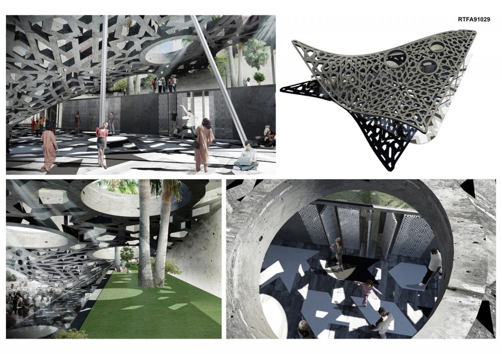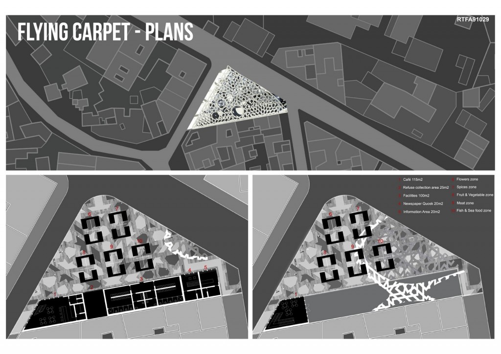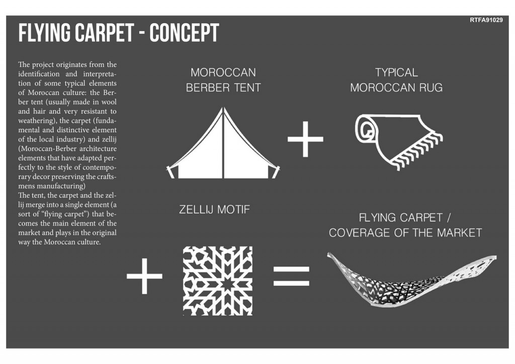 The tent, the carpet and the zellij merge into a single element (a sort of “flying carpet”) that becomes the main element of the market and plays in the original way the Moroccan culture. The “Flying carpet” is both structure and coverage.