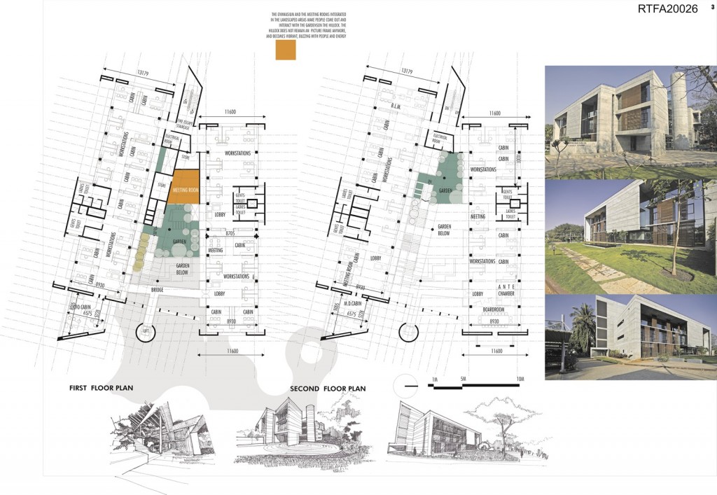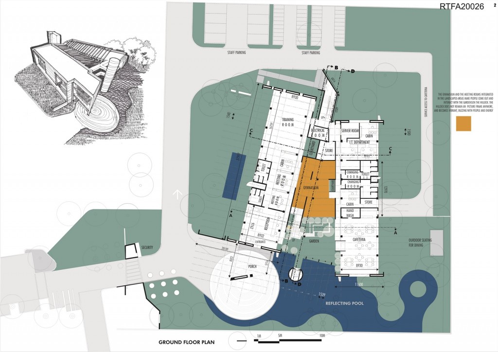The elevator was planned to be taken away from the work space so as to discourage users to access for vertical circulation. Instead the beautiful, lush Hillock was created to act as a effortless walk up or down, creating an experience which is very personal and rich. The reflecting pool collects storm water from the roof and the overflow runs into tube wells driven to recharge ground water. There are two more tube wells on the West side which collect the remaining storm water from the building. The visual appeal of the buildings is minimalistic expressing its deeper self without any cosmetics and frills. The spaces have a vibrant and simultaneously a very meditative emotion. Character of the building is international, but at the same time it is rooted in its place and culture.