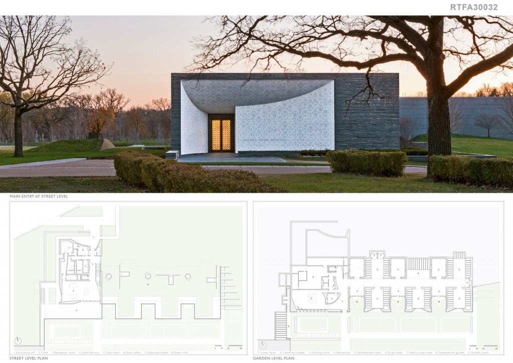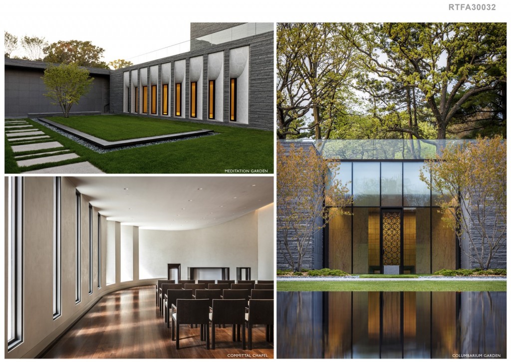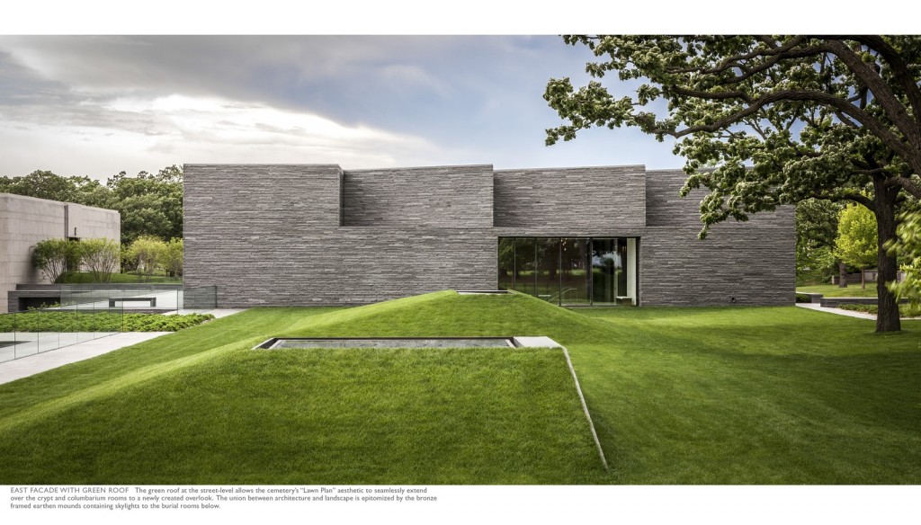 Program: The 24,500 square-foot Mausoleum is anchored by a two-level building housing a committal chapel and reception space for communal activities that unfolds into a series of garden-level chambers for over 10,000 interments. With 4,800 columbarium niches (for cremated remains) and 750 full-body crypts, the Mausoleum embraces a growing market for cremation while preserving the undeveloped 25 acres for future generations. Occupying less than half an acre, the building footprint takes up only a fraction of the 7 acres required to accommodate 10,000 in-ground casket burials.