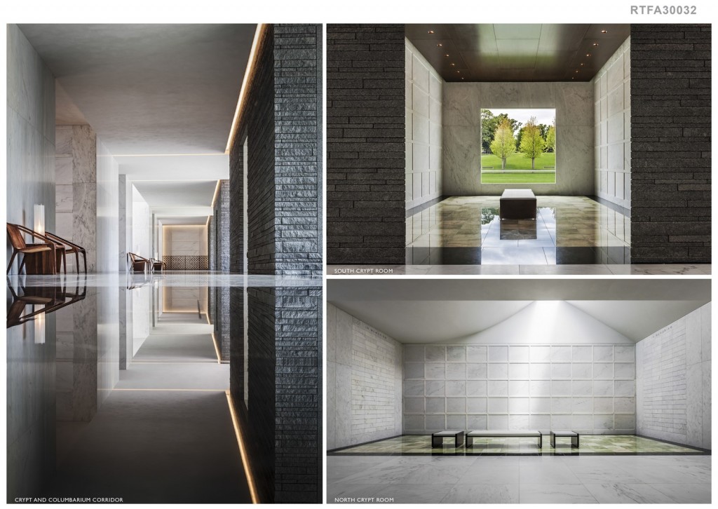 Entering through the street-level building pavilion, visitors descend to the garden-level under a rhythmic sequence of top-lit clerestories before entering a corridor flanked by intimately scaled crypt and columbarium rooms for quiet reflection. The material palette calls upon visual and experiential senses while recalling centuries of memorial tradition. Locally-sourced granite, marble and bronze—selected and detailed to last centuries while celebrating contemporary expression—frame each change of material through precise detailing and subtle tactile changes.