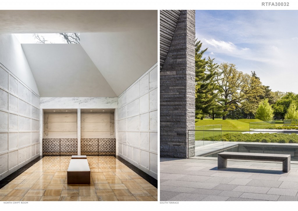 Design Intent: The Mausoleum minimizes the visual impact on its historic landscape by nestling more than three-quarters of the building into an existing south-facing hillside. A green roof discretely extends the northern sweep of lawn over the burial chambers, with each room marked on the ground plane through a single bronze-trimmed earthen skylight mound or oculus. Along the southern facade, a series of pavilions breaks down the scale of the garden wall, defining intimate crypt and columbarium gardens.
