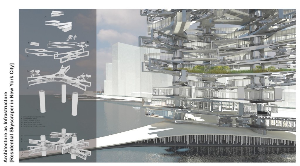 Three super-columns act as cores and as a structural system. Pods are piled on and around each super-column and host residential units, or wind mills, or solar panels. Every 5-to-7 stories larger, green pods of amenities span all three super-columns to brace them in a truss-like system. Nine large-size wind mills top the tower and blur in the wind.