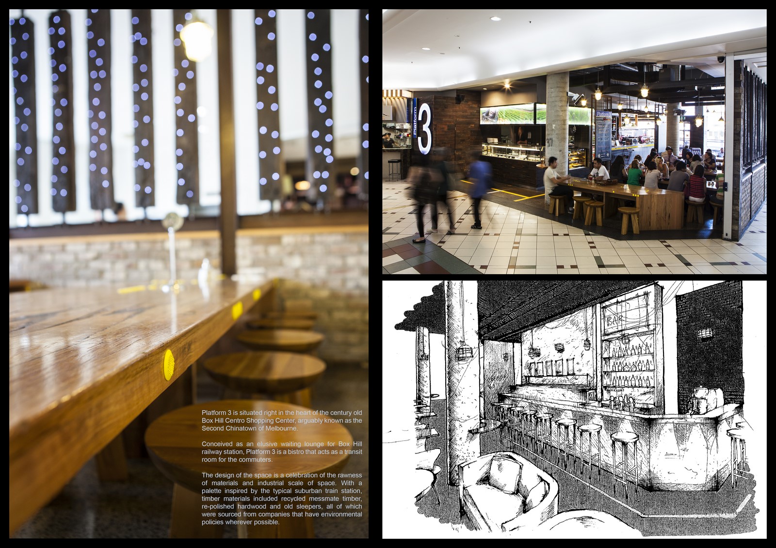 Platform 3 is situated in the heart of the century old, Box Hill Centro Shopping Centre. The client sought to offer a public space with character that offers homage to the industrial feats of the area.