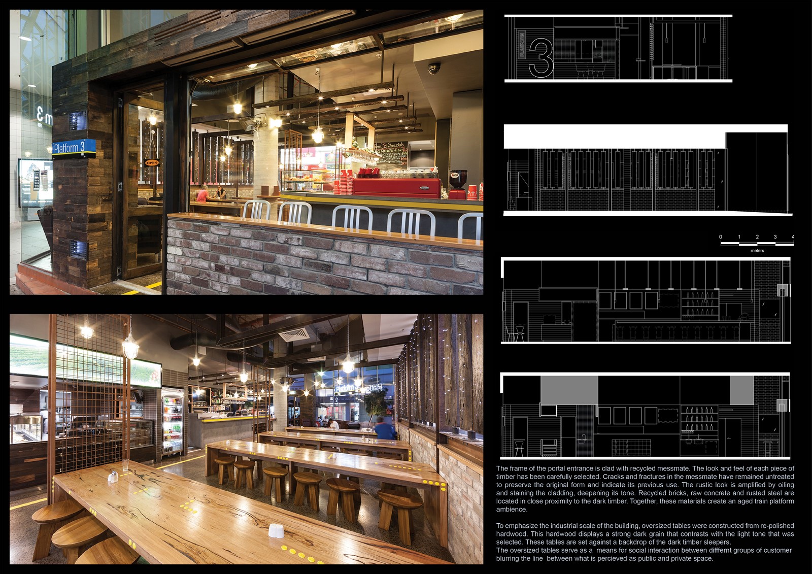 The boundaries between what is perceived as public and private domains were challenged in this project resulting in a outcome that engages its users in an unconventional way. The characteristics of sharing space and the notion of being in a congested railway station has been brought to the dinner experience. The unusual seating arrangement of four long, communal benches was designed to encourage people to share tables. The intension of this design was to create a “market feel” and reinforces the casual dining theme. This also maximized the seating capacity. The idea of a group of patrons sharing the same dinner table is to resemble the shared seating space inside the train cabin.