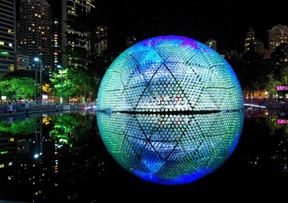 A total of 4,800 five-gallon polycarbonate water bottles were acting as individual beacons, referencing the cavernous shape of traditional Chinese Paper Lanterns. These plastic bottles contains LED torches that are attached to the pre-fabricated triangular modules and are assembled as a pavilion on-site, whose interior is fitted with a sea of 2,300 bottles hanging in an undulating formation from the ceiling. There is also an opening at the crown of the 20-meter-diameter sphere allows moonlight to pass inside, lighting up both in the internal space as well as the reflective pool of water it sits on. The position of the floating sculpture manifests refractions of changing lunar phases on the surface of the water.
