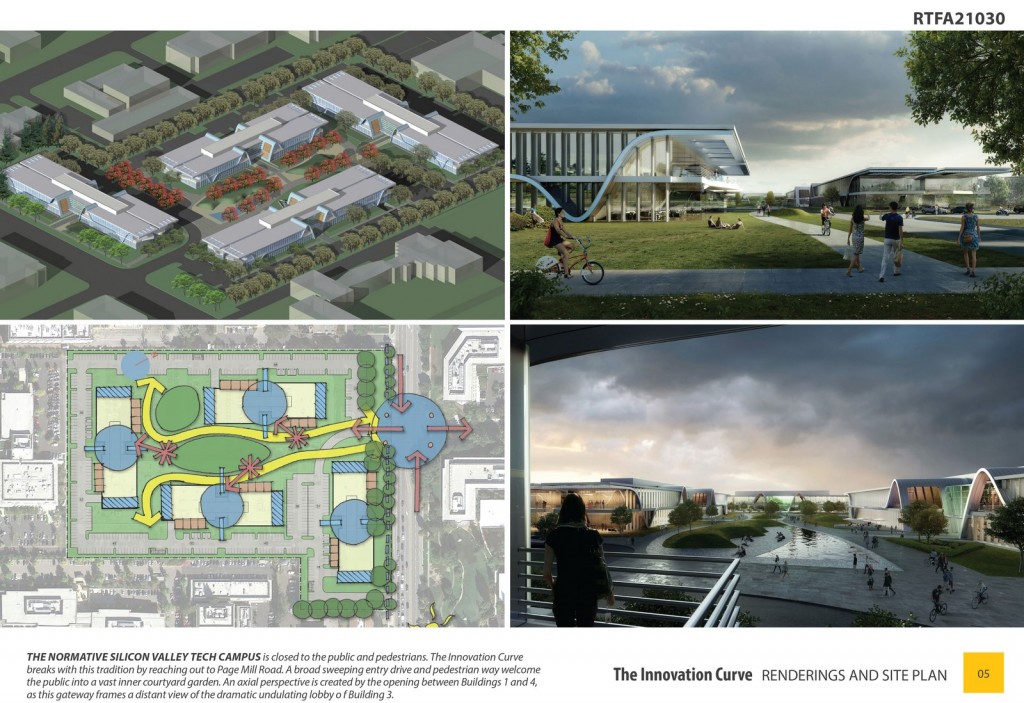 The Innovation Curve is a proposal for a new workplace that is flexible, open and uses a dominant design element to celebrate the innovation process that is so often associated with its geographical location of Silicon Valley. The proposed project rises on a hotspot in the golden geography of the bits economy. Located on the edge of Stanford Research Park, the site sits directly across the street from the Hewlett Packard Headquarters. The two existing buildings were deemed inimical to future growth for the sought-after tenants, these obsolete structures are slated for demolition. But their previous occupants are just as legendary as their immediate neighbors: the two bars housed the most recent headquarters of the giant company Facebook.