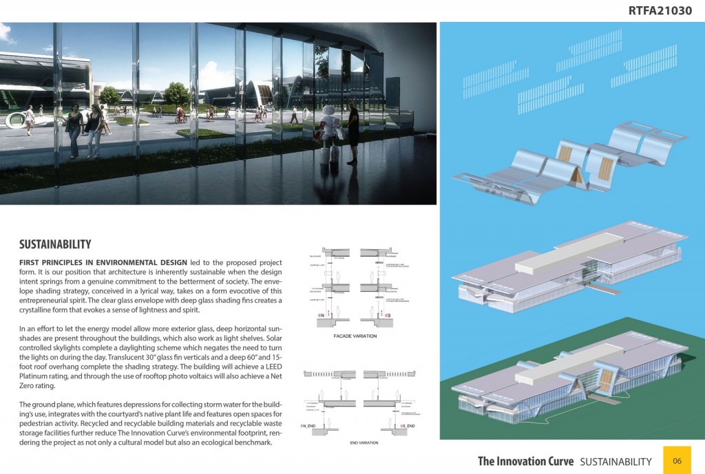 Ever conscious of the importance of sustainability, the envelope shading strategy, conceived in a lyrical way, takes on a form evocative of this entrepreneurial spirit. The clear glass envelope with glass shading fins creates a crystalline form that evokes a sense of lightness and spirit. In an effort to let the energy model allow more exterior glass, deep horizontal sunshades are present throughout the buildings. Translucent glass fin verticals and a deep roof overhang complete the shading strategy. The building will achieve a LEED Platinum rating, and through the use of photo voltaics will also achieve a Net Zero rating.