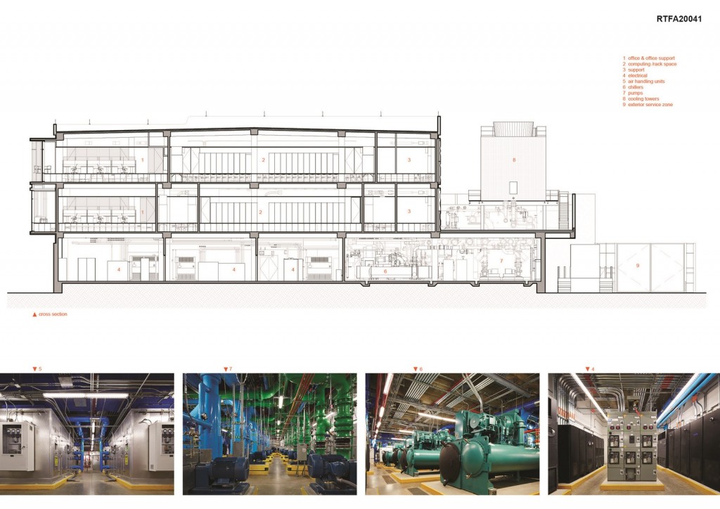 The ground floor is primarily occupied by mechanical, electrical and plumbing equipment that supports the computing rack spaces located on levels two and three. The level two and three computing floors create a “box within a box” concept for the rack space and place the office and office support space outside the box. A service corridor surrounds the computing space providing access to the racks and creating a desired buffer from the exterior. The office space is located along the north face of the building providing both daylight and views for staff while reducing direct heat loads. The undulating north office glass facade creates collaboration alcoves between the glazed exterior wall of the building and the office space.