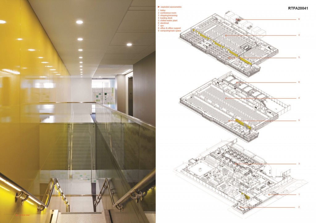 The east and west facades of the building align with the existing garage. The main entry volume is pulled to the west creating a clear entry sequence from the corporate campus. The conference and team areas are cantilevered over the entry further enhancing visual connectivity between the Computing Center and the main campus to the south. The employee and visitor access to the level 2 and 3 computing spaces are adjacent to the lobby and a public conferencing area and can be reached either via an elevator or a cascading stair. A wall adjacent to the cascading stair separates the computing rack space from the office space. It is clad in a vibrant yellow wood panel system that graphically enforces the concept of the box in a box.