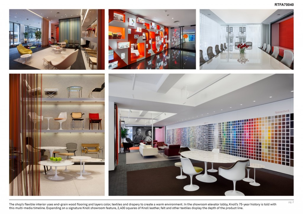 In the shop, end-grain oak flooring combined with layers of color, textiles and drapery create a warm, residential environment. Full-height, illuminated lacquer shelving takes advantage of the double-height space, allowing furnishings to be vertically displayed. A fully glazed storefront broadcasts the Knoll brand to the street. In the showroom above, vibrant textiles and finishes, inspired by founder Florence Knoll’s creations, draw visitors through the space, setting off its residential and workplace furnishings. A graphic timeline tells Knoll’s story through graphics, textiles and objects. A carefully choreographed path weaves through furniture displays, supporting a narrative sequence for Knoll’s products. 2,400 textile, leather and felt samples fill a 55-foot wall — a stunning graphic display of the depth of Knoll’s product line.