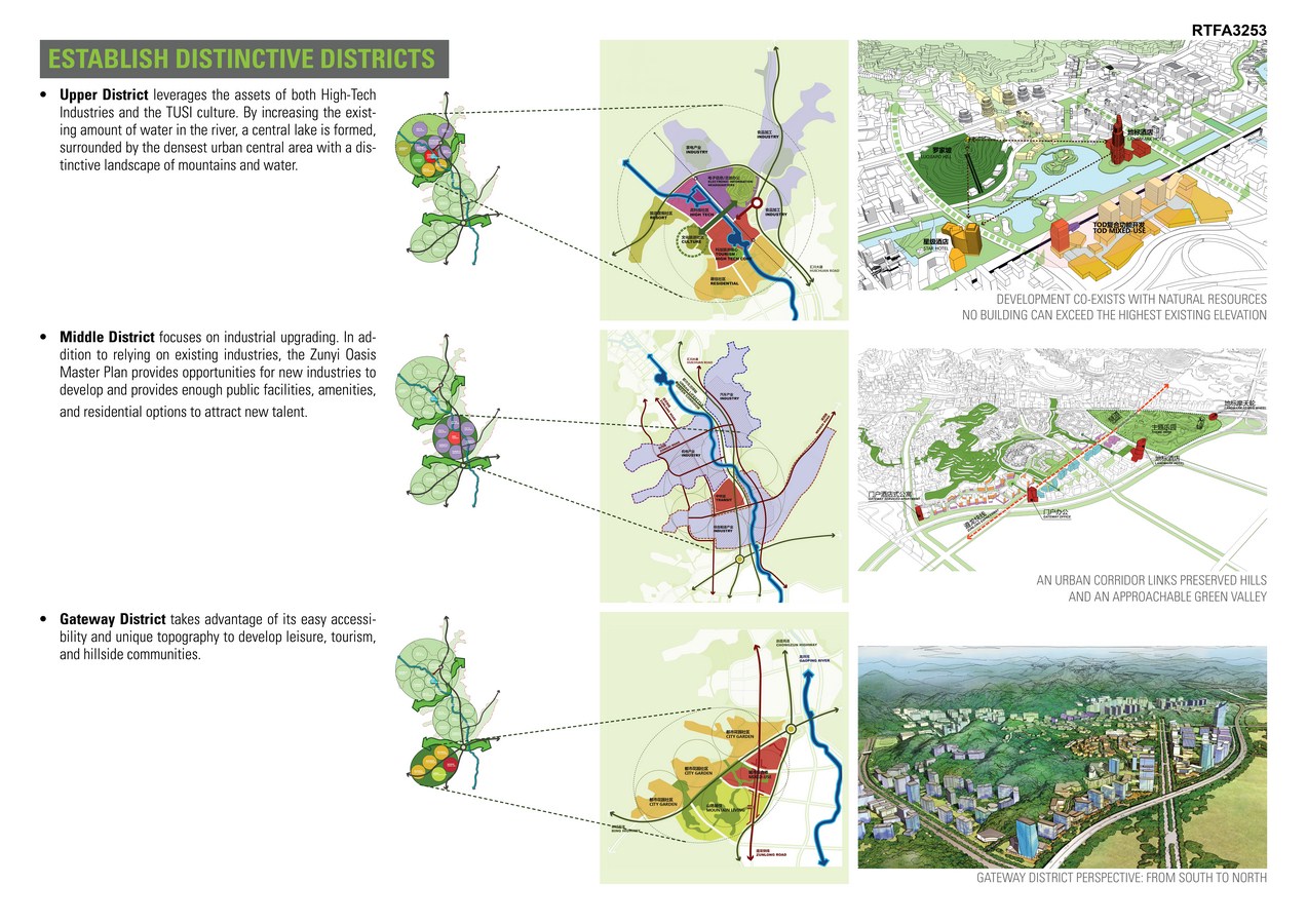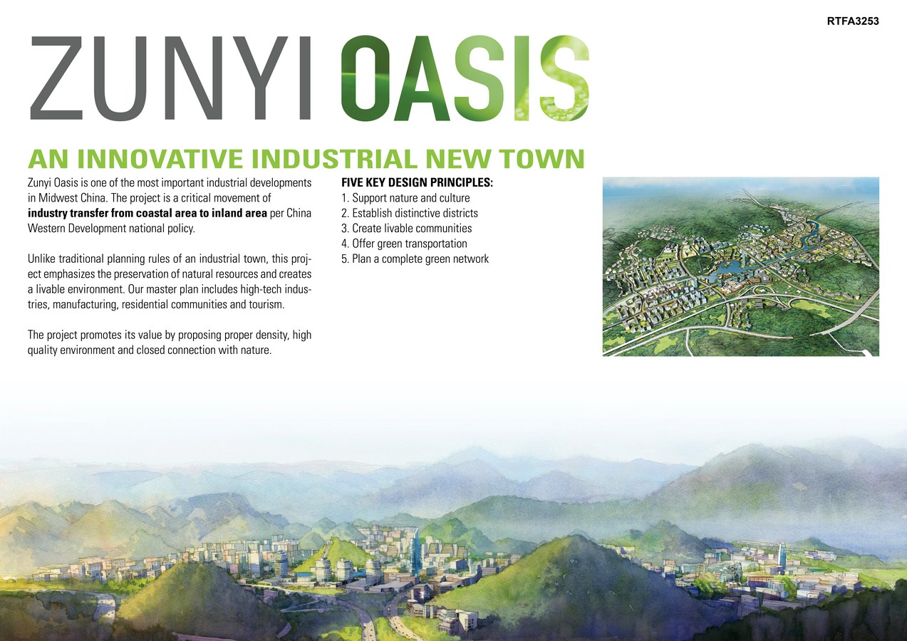 The Zunyi Oasis master plan shatters precedents and establishes new paradigms for planned mixed-use communities in China. The ambitious plan promotes integrated high-tech industries, manufacturing, residential communities and tourism. Guiding design principles include protecting and supporting existing nature and culture, establishing distinct districts, creating livable communities, offering accessible transportation, and planning a complete green network across the site.