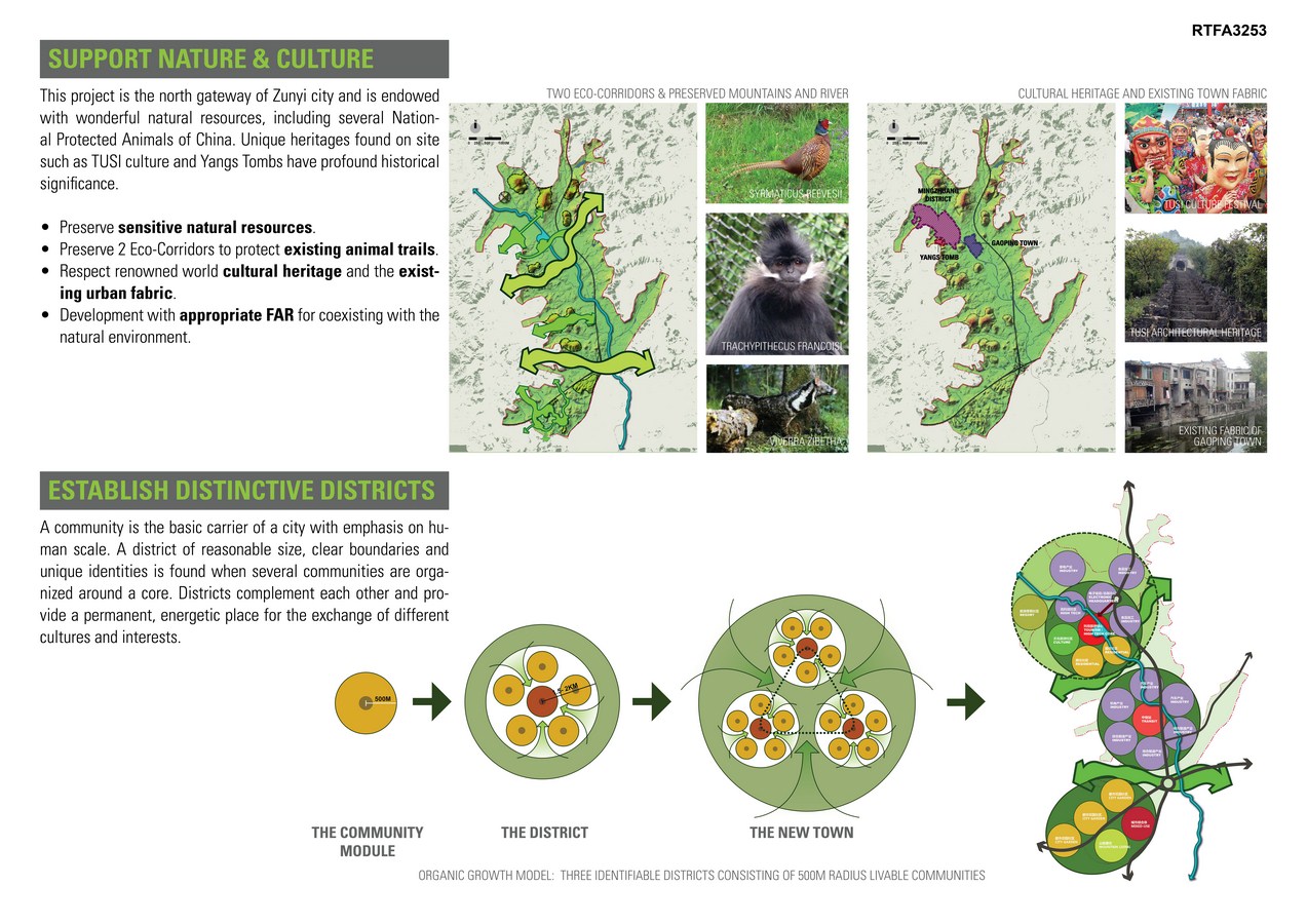 Unlike the conventional planning attributes of an industrial town, Zunyi Oasis emphasizes the preservation of natural resources to create a livable environment. The existing ecological resources of the site provide an opportunity to distinguish itself from other established industrial parks, which lack living environments. The master plan preserves sensitive natural resources including mountains, a river, and two “Eco-Corridors” that protect existing animal trails. Zunyi Oasis also respects existing urban fabrics and the renowned world cultural heritage represented by TUSI culture. The focus is on creating a green environment of unique characteristics in which to work and live, in order to attract talent. Continuous sidewalks, public transportation and bicycle routes provide a green network of transportation throughout the site to allow citizens and tourists ecologically “clean” transit options, and promote personal interaction. Amenities located within a 5-minute walking distance facilitate increased interaction between functions, and lead to synergistic relationships.