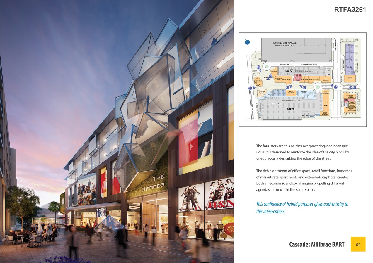 Conceived as a miniature city brought together by retail, live/work/stay, and hotel capabilities in one locale to a place that never sleeps, the Cascade mixed-use development gives identity to the greater region and Millbrae. The project includes 150,000 square feet of office space, up to 45,000 square feet of retail space and as many as 350 market-rate apartments along with a 110-room extended-stay hotel. Considered a gateway location, this transit-oriented development project grows out of a transportation node with a regional bus drop off, generous parking, and plenty of amenities to jump-start the vibrant use of a brand-new piece of the suburban fabric.