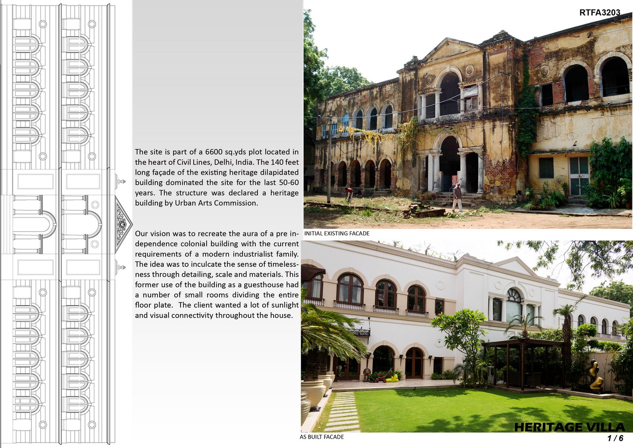 The site is part of a 6600 sq.yds plot located in the heart of Civil Lines, Delhi, India. The 140 feet long façade of the existing heritage dilapidated building dominated the site for the last 50-60 years. The structure was declared a heritage building by Urban Arts Commission.