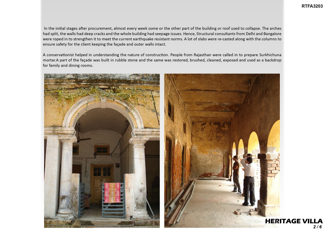 In the initial stages after procurement, almost every week some or the other part of the building or roof used to collapse. The arches had split, the walls had deep cracks and the whole building had seepage issues. Hence, Structural consultants from Delhi and Bangalore were roped in to strengthen it to meet the current earthquake resistant norms. A lot of slabs were re-casted along with the columns to ensure safety for the client keeping the façade and outer walls intact.