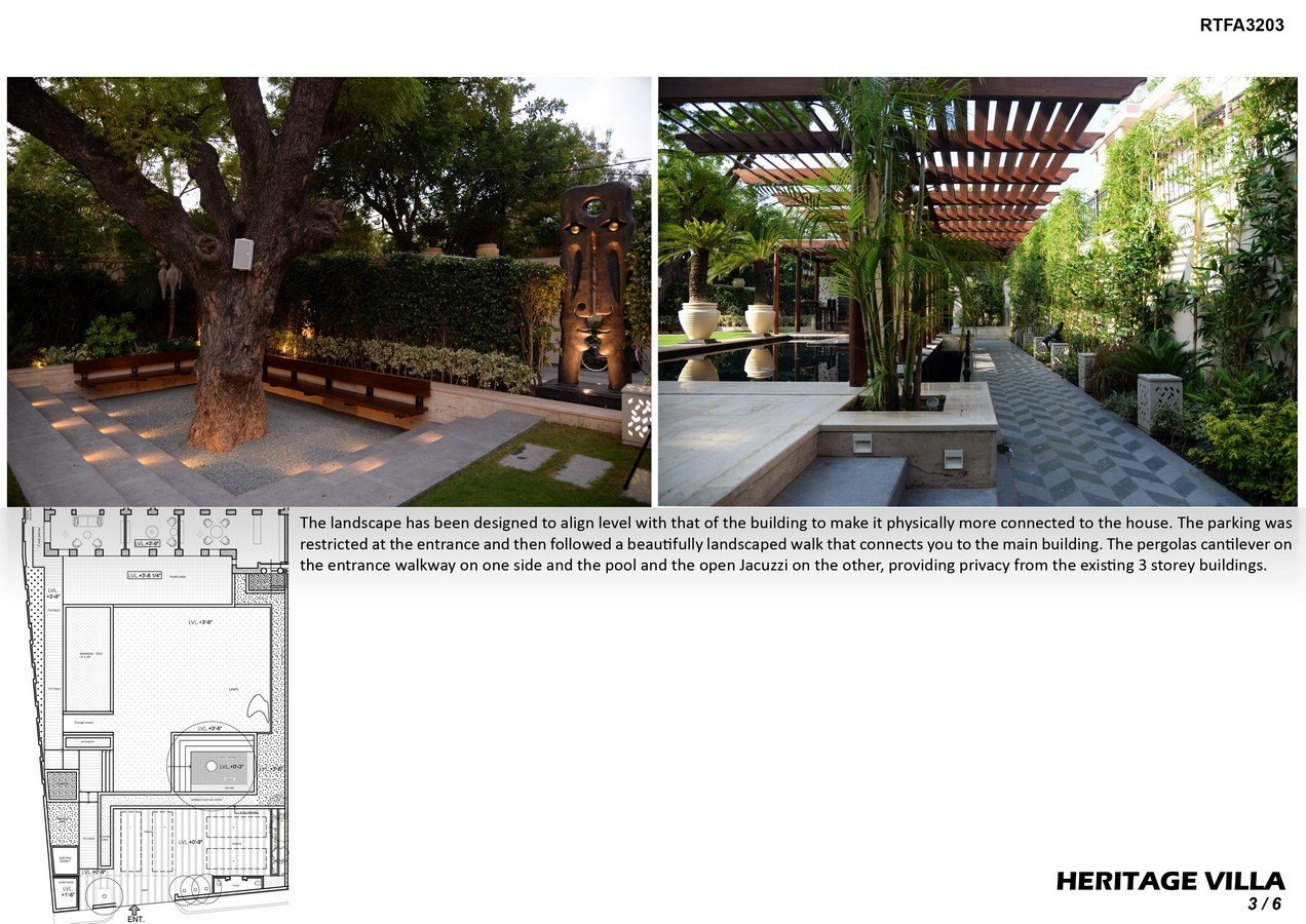 The landscape has been designed to align level with that of the building to make it physically more connected to the house. The parking was restricted at the entrance and then followed a beautifully landscaped walk that connects you to the main building. The pergolas cantilever on the entrance walkway on one side and the pool and the open Jacuzzi on the other, providing privacy from the existing 3 storey buildings. In spite of being a colonial building we made sure the inside and the outside marry well with each other, hence, the repetitiveness of the arches, the alignment of all fenestrations, the scaling of the courtyard and workmanship define the interior language throughout.