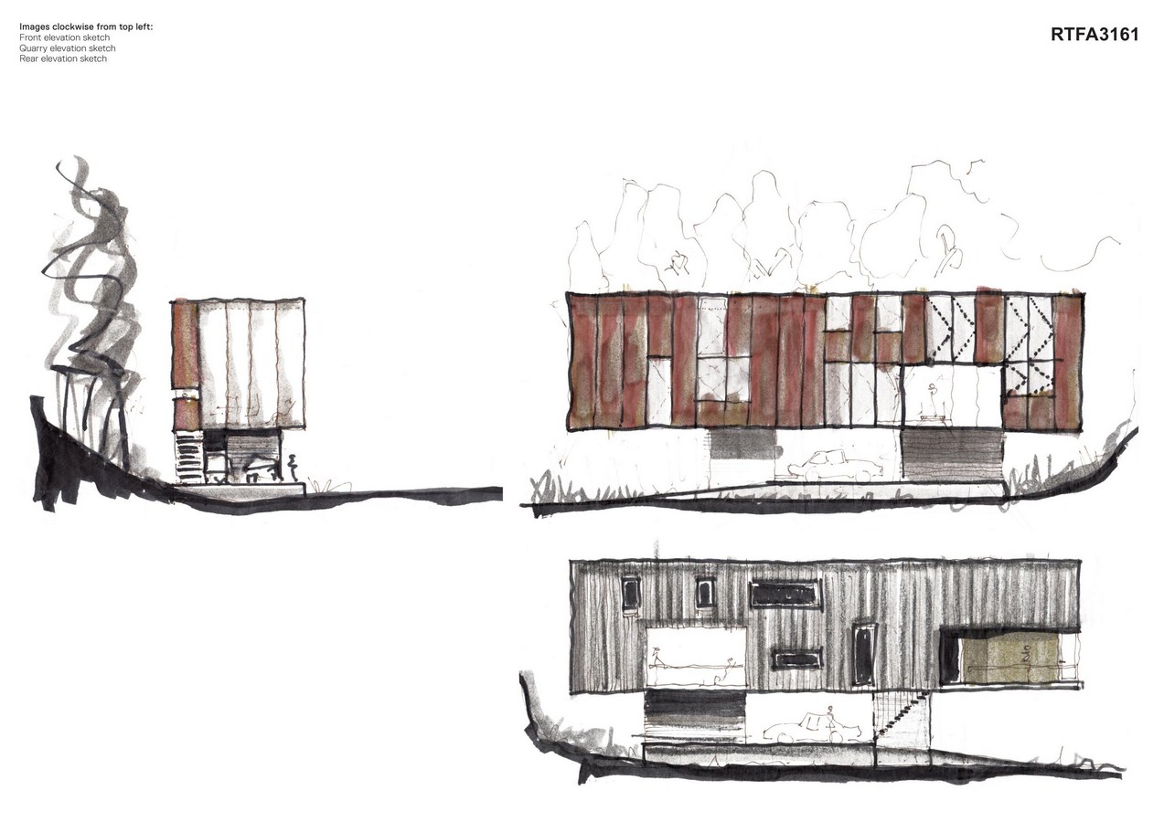 It was decided early that due to the shear scale of the quarry face, a raised ground level would be advantageous in order to maximise available sunlight and views. This provides space for plant, utility and external storage together with 2 parking spaces tucked neatly under the proposed dwelling above. The ascension continues up a flight of stairs to reach the primary habitable space, through onto the study, living, kitchen & dining terminating at the second floor bedroom level.
