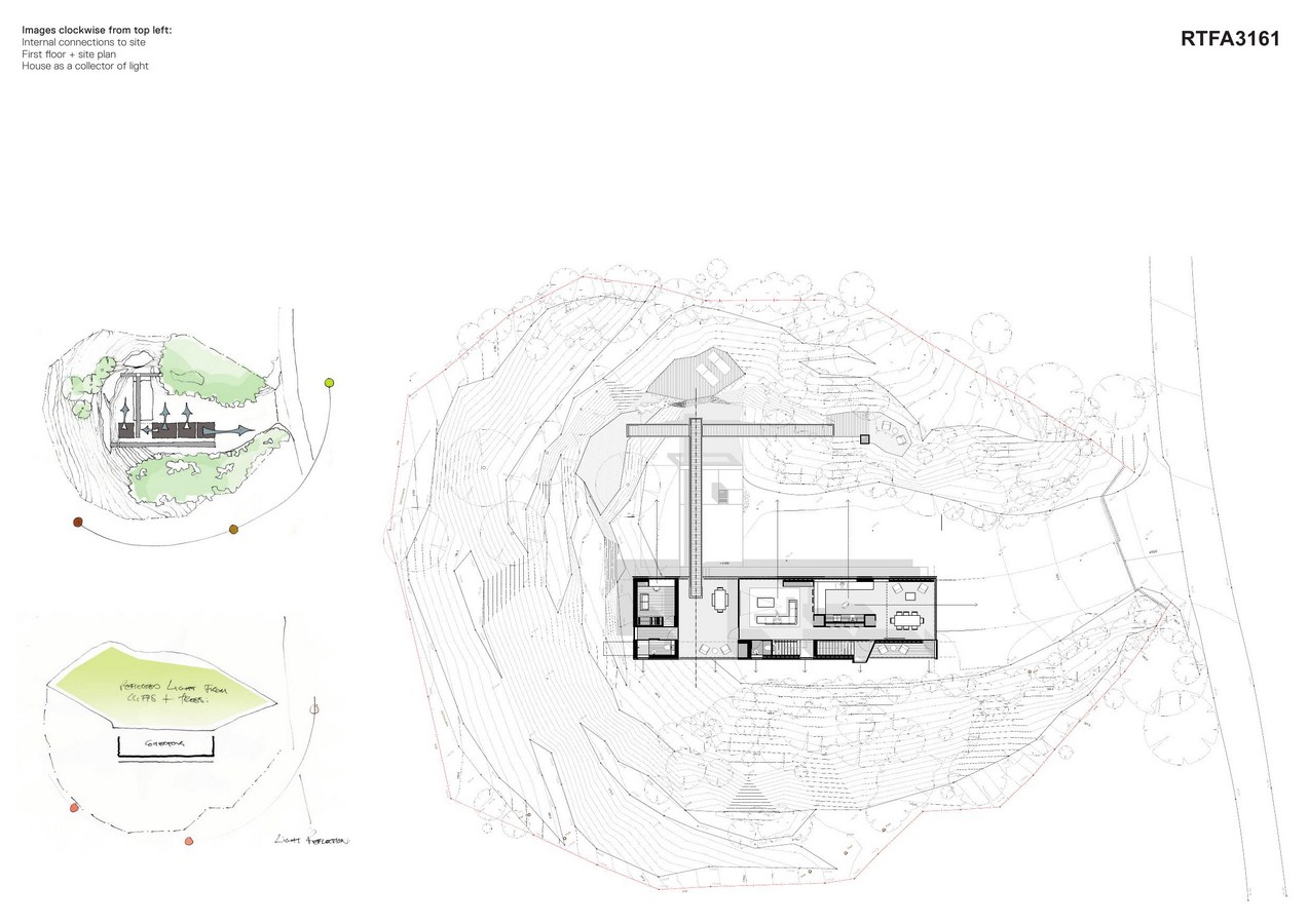 Concept diagrams: The diagrams on the submitted A3 sheets show the evolution of the design idea. The position of the building is dictated by the conscious decision to retain the garden on the northern bank with its various plateaus. The building nestles on the opposite side collecting bounced light off the northern cliff face. The position of various activities within the house is a direct response to the external context and views.