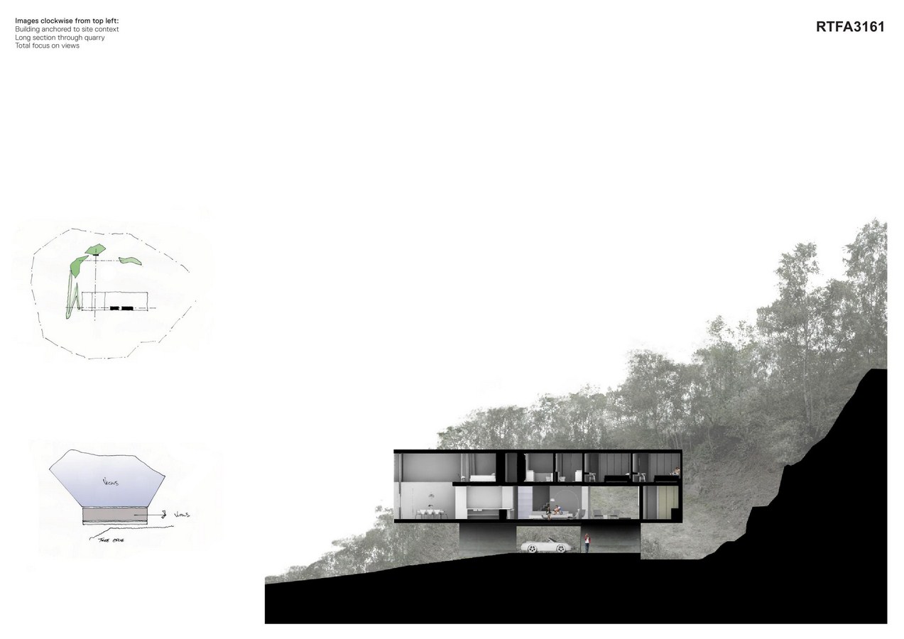 Concept + Parti: As a diagram the arrangement is divided into a circulation spine that serves habitable and functional space. In essence a ‘servant + served’ plan, where stair-cores become anchors along this spine. The house is perceived as a suspended form within the spatially stimulating volume of the quarry, psychologically reinforced by the dramatic cantilever on the approach.