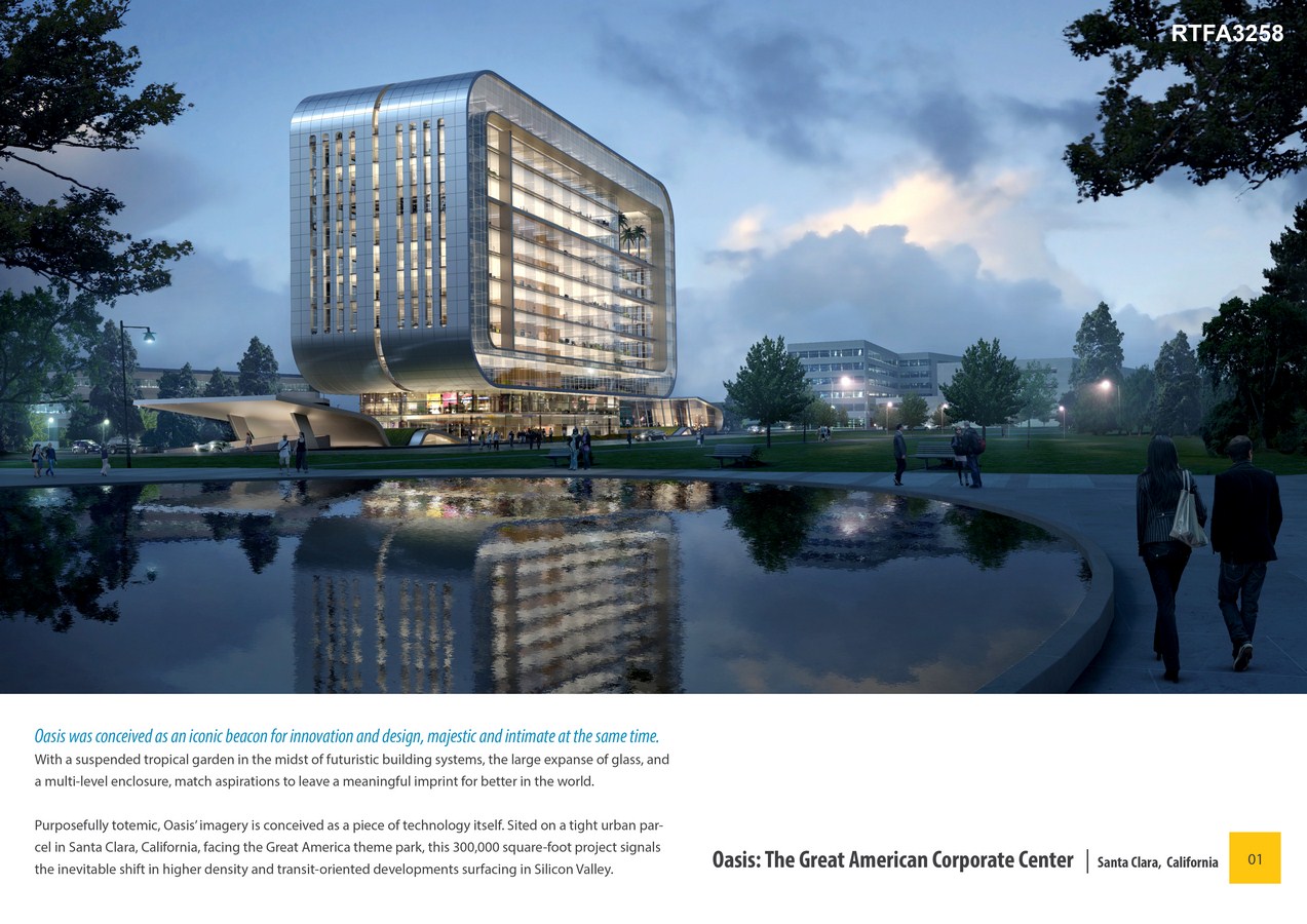 Purposefully totemic, Oasis’ imagery is conceived as a piece of technology itself. Its iconicity is justifiably technologically poignant. Sited on a tight urban parcel in Santa Clara, California, facing the Great America theme park, this 300,000 square-foot project signals the inevitable shift in higher density and transit-oriented developments surfacing in Silicon Valley’s anonymous, often uninspired landscape.