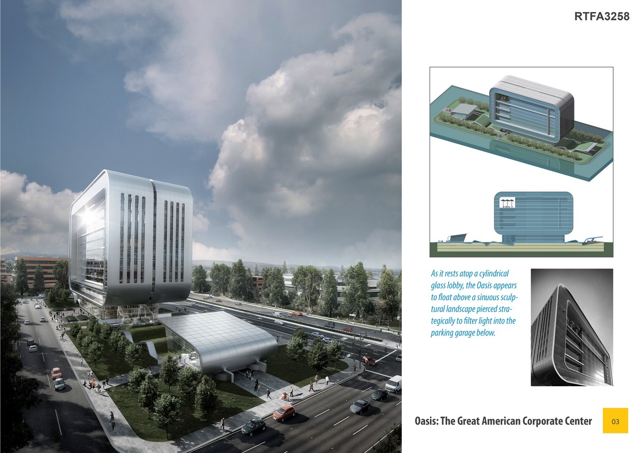 Intended as a prototype of tomorrow’s workplace, Oasis’ vision asserts itself at a distance to coax the visitors into a world of urbanity and surprise. Set apart, and still in the city, the glimmering 13-story object raises in the sky on a transparent podium as the pinnacle of the immaterial. Conferring lightness and friendliness while protecting the preciousness of ideas in formation in an industry constantly reinventing the future. On a tongue of pushed and pulled earth, pierced strategically to filter light into the parking garage below, the shift from the suburban to the urban takes place, the choreographed earth movement brings excitement and awareness.