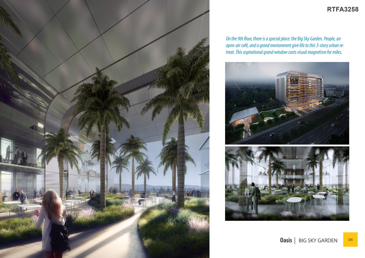 On the 9th floor, there is a special place: the Big Sky Garden. People, an open-air café, and a grand environment give life to this 3-story urban retreat. This aspirational grand window casts visual magnetism for miles. This is the place you want to be, the ultimate treat in this journey of architectural seduction, the aspiration of its occupants to inhabit its rewarding preciousness. We wanted the Big Sky Garden to be embedded in the platonic completeness of the elevated massing, yet set apart as an experience both within the building and in its relation to the object’s surroundings. As an object of technology Oasis conveys desire. We wanted it big, yet accessible. Permeable, and private. Public, and intimate. Oasis is the poster child for the future of Silicon Valley.