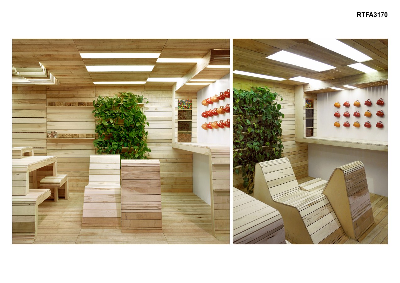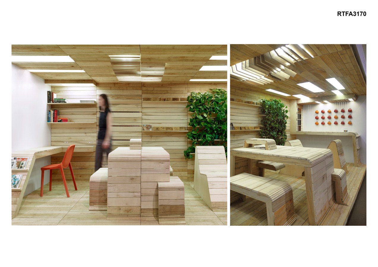 Despite the ease of assembly and use of a reclaimed material, attention to detail is not overlooked. In sinuous forms, the reclaimed wood boards morph from the wall and floor into furniture elements, sanded smooth where the human body comes in contact with the wood and left rough where it does not. Modular shelves can be inserted into slots between wall boards, creating adjustable display and storage areas. Smaller ledges slide into gaps between the wood slats. Greenery fills the shelves on the back wall in the lounge module to provide a fresh and calming atmosphere. Over the collaborative workspace, ceiling boards pivot open creating an adjustable light fixture. Once the modules are assembled, the power points are connected (outlets and light fixtures) and when are plugged into a generator, the POP-UP Office is immediately operational.