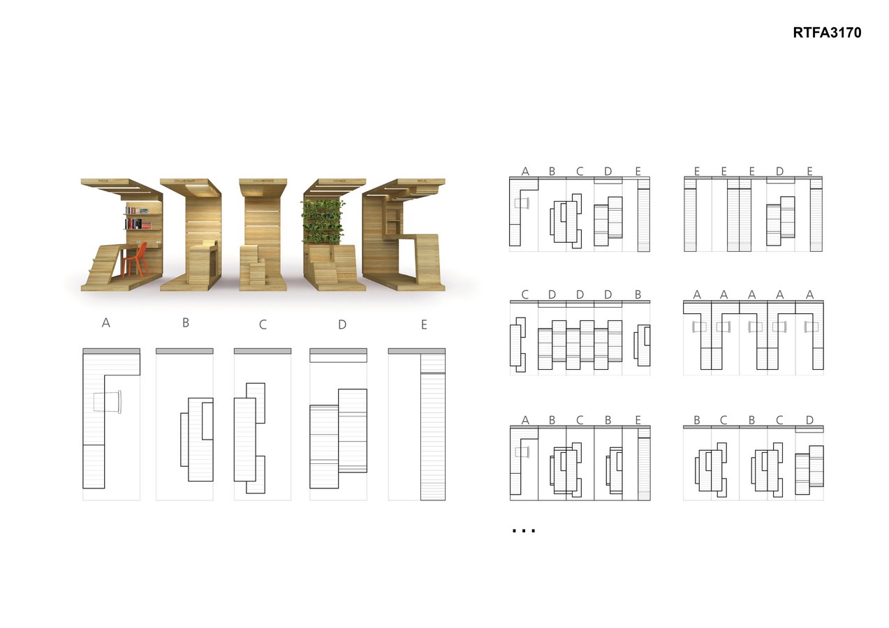 The POP-UP Office is a new typology of office space that responds to this new work order. It is an alternative to the typical static office – re-imagining a work environment that is adaptable and modular. Comprised of modular units that can be combined in different ways, the POP-UP Office is built out of reclaimed wood shipping pallet boards and their frames. Separate modules collectively form the modern work place, facilitating both individual work and collaboration – a workspace, collaborative space, lounge area, and refueling station. The modules each consist of separate planes (floor, wall, ceiling) and furniture elements constructed in advance that can be assembled in different configurations.