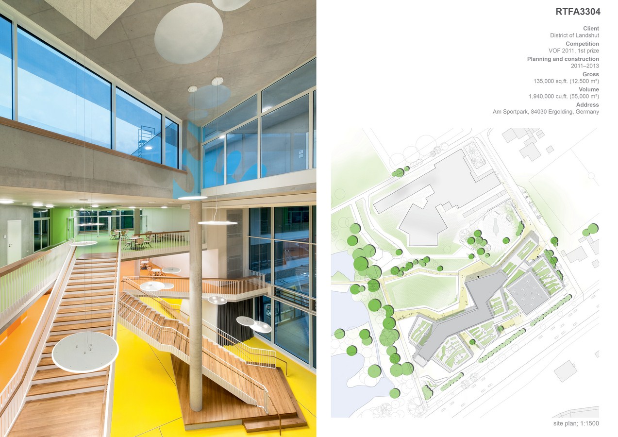 The new Ergolding Secondary School sits within a far-stretching natural and artificial landscape. 70 km north-east from Munich, it provides the much needed secondary school capacities to the region around the Bavarian town of Ergolding, close to Landshut.