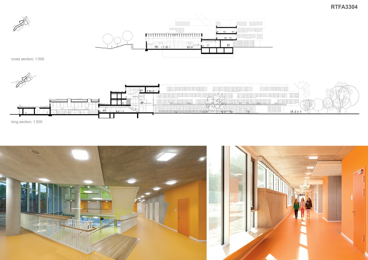 The heart of the new school is a large open atrium that serves as an assembly hall, an interior meeting point, and a visual connection between the school’s various departments and functions. Through this central hub, students can easily and intuitively find their way from the classrooms on the upper levels down to the music area, the gymnasium, the cafeteria, and the recreation rooms that sit on the ground level. The hallways that lead from the classrooms and workshops gradually open up and broaden to become ‘extensions of the classrooms’ themselves with individual and group working spaces. These provide the students, teachers and parents with informal meeting points for gathering, planning extracurricular activities, and exchanging information. These ‘learning landscapes’ essentially strengthen the pedagogical work within the new building.