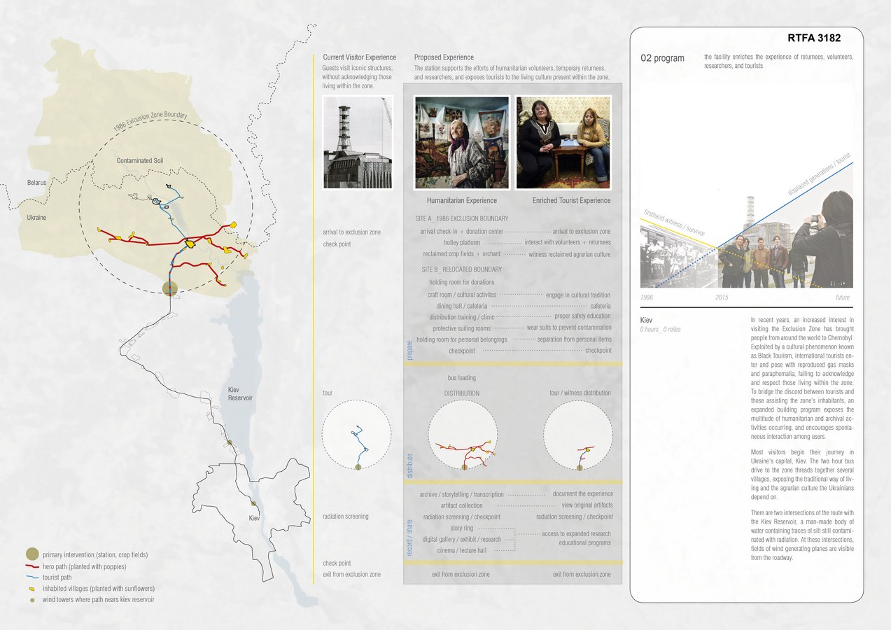 The deadly explosion, facing its 30 year anniversary in 2016, displaced 110,000 residents from their homeland. Shortly after, however, 2000 villagers returned to their contaminated motherland, unwilling to be exiled. Nearly 140 returnees remain today. While the physical effects of the disaster have been represented through photography and film, at times exploited by a cultural phenomenon known as Black Tourism that has caused an annual increase of international tourists to enter the zone and pose with reproduced gas masks and paraphernalia, the physiological impacts have yet to be properly addressed. The displaced generation exhibits severe depression, anxiety, and a loss of personal value and identity. Encouraging this group to acknowledge their ability to provide healing to themselves and others, the proposal offers them an opportunity to temporarily return and engage with expanded humanitarian efforts to aid and interact with the remaining villagers.