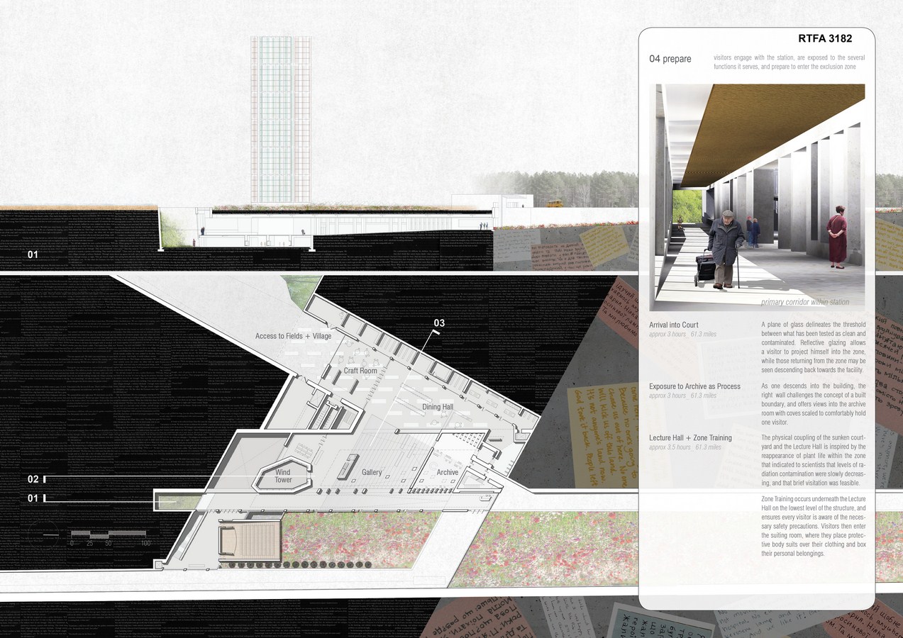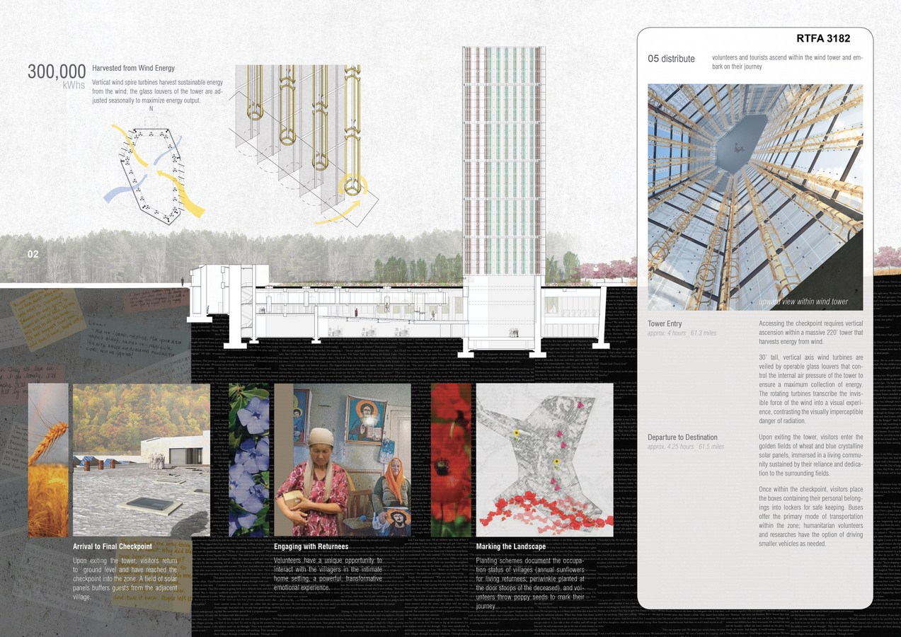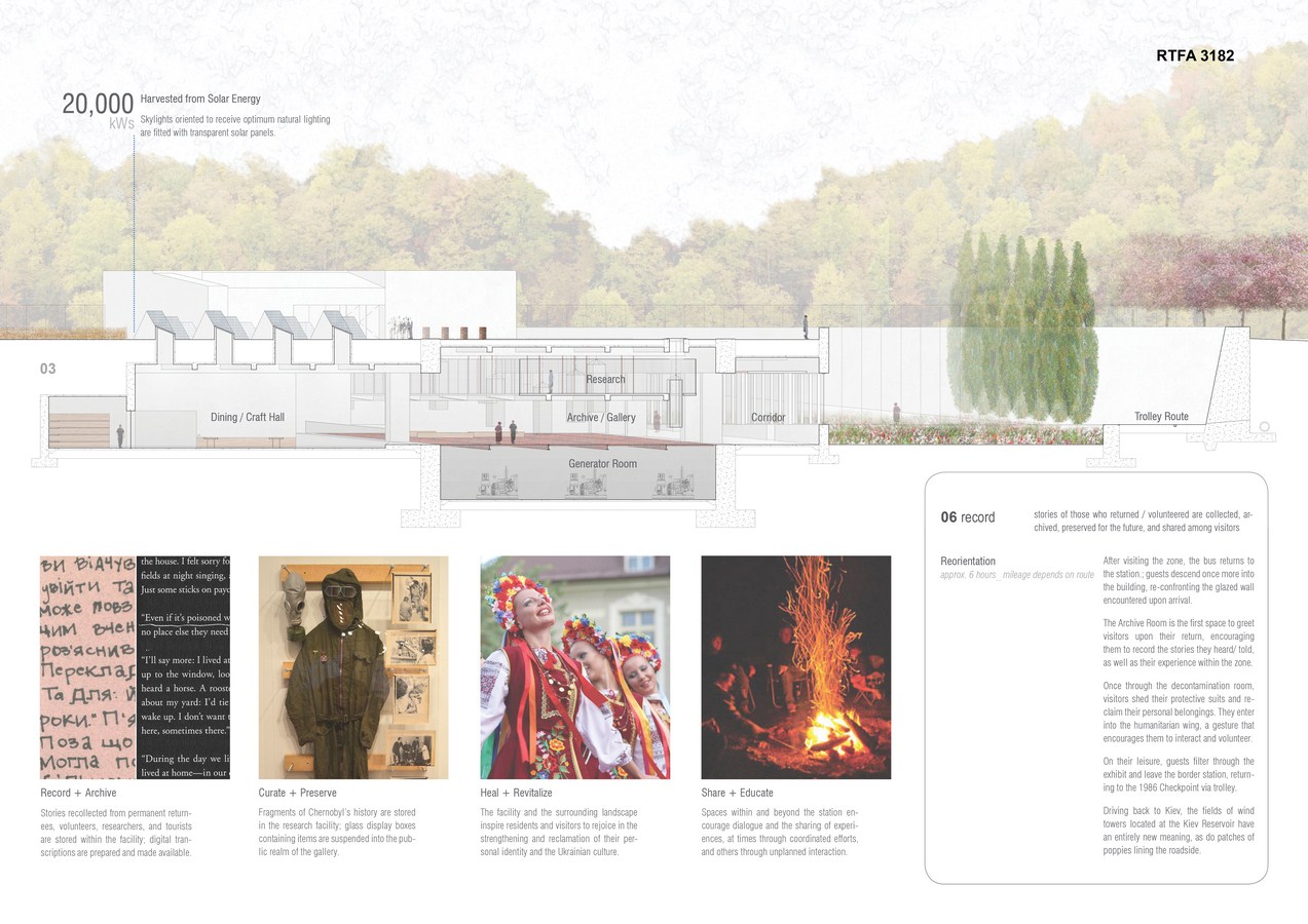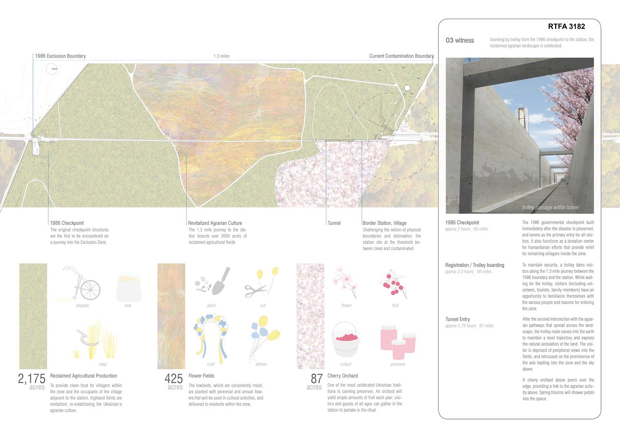 Located along the tested threshold of contamination (1.3 miles north of the 1986 Checkpoint), the primary intervention manifests as a border station, humanitarian volunteer center, research facility, and evolving memorial. The concrete structure nestles into the earth, and is accessed by trolley. The intimate connection with the landscape allows occupants to observe and witness seasonal variations, as well as continued remediation of the region. Above the facility, reclaimed agricultural fields re-establish the Ukrainian’s agrarian culture and provide crops (physical necessity) and flowers (emotional comfort) for zone occupants. An adjacent village derived from vernacular architecture offers permanent dwellings for the farmers and temporary living quarters for returnees and researchers.