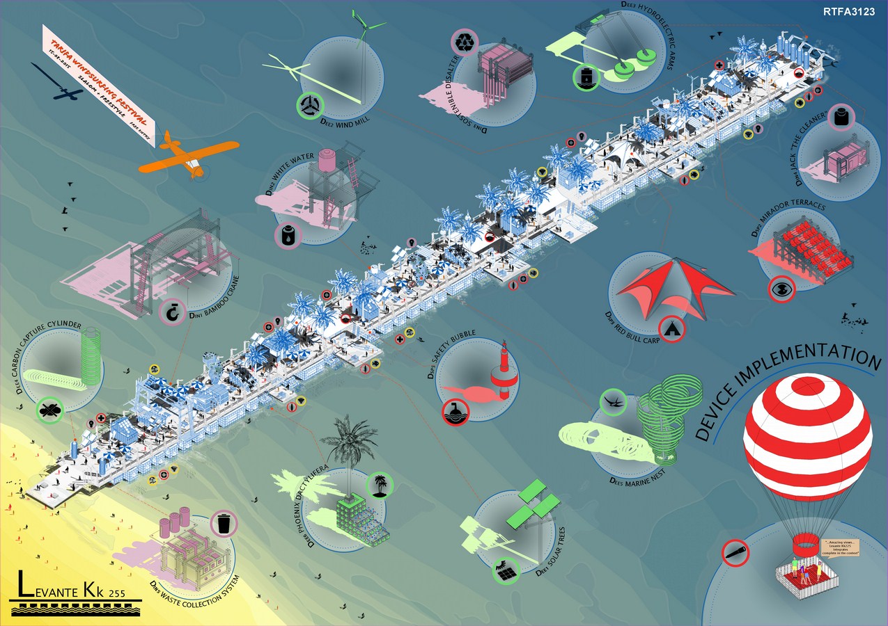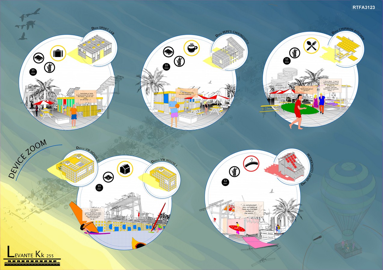 Levante Kk255 is the construction of a collective floating residence where the accomodation takes part in a complex system of private and common areas. The housing units externalize kitchens and living areas, which are concentrated on the outside for the construction of shared areas. In the latter, which are conceived as an extension of the individual space, are implemented areas for relation and leisure, for the development of the daily life and of this big “wanderer family”.