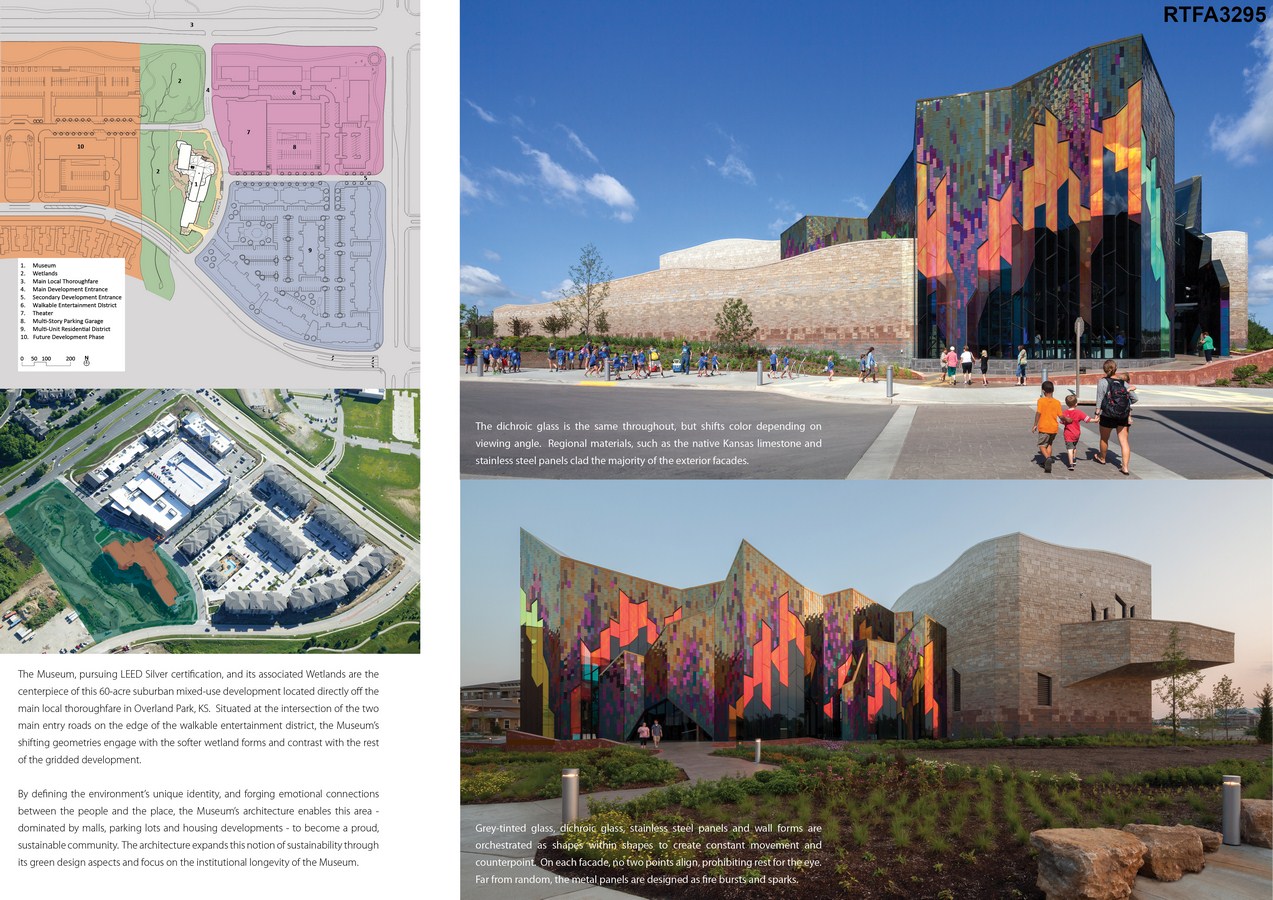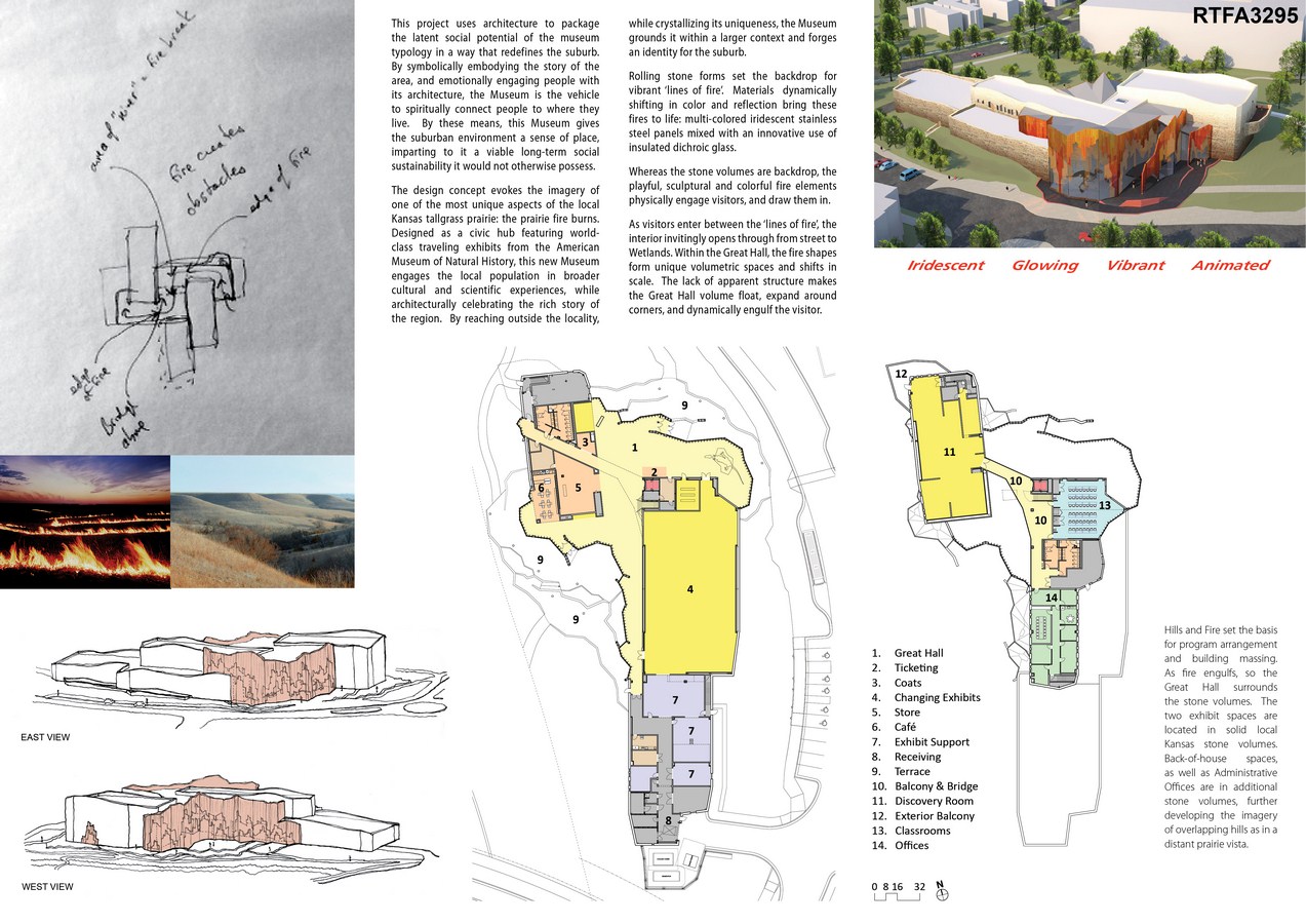 To be considered a ‘place’, an environment must have a unique identity – a story to tell. The design concept evokes the imagery of one of the most unique aspects of the local Kansas tallgrass prairie: the prairie fire burns. Designed as a civic hub featuring world-class traveling exhibits from the American Museum of Natural History, this new Museum engages the local population in broader cultural and scientific experiences, while architecturally celebrating the rich story of the region. By reaching outside the locality, while crystallizing its uniqueness, the Museum grounds it within a larger context and forges an identity for the suburb.